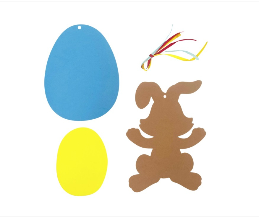 Adu bucuria sărbătorii Paștelui în casa ta cu acest set creativ. Setul conține 3 figurine din carton în formă de puișor, ou și iepuraș, stickere pentru decorat și 3 panglici pentru agățat. Dimensiunile unei figurine: 15 x 11 cm.