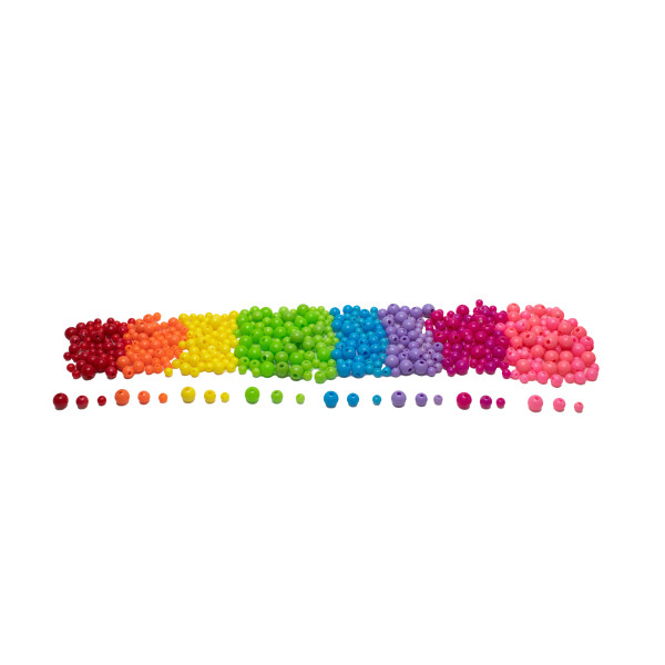 450 de mărgele din plastic fluorescent, ideale pentru a adăuga o notă vibrantă creațiilor celor mici. Pot fi folosite pentru a crea brățări, coliere sau obiecte decorative originale și colorate. Înșirarea mărgelelor stimulează creativitatea, coordonarea ochi-mână, abilitățile motorii fine, dexteritatea, îndemânarea, atenția și concentrarea. De asemenea, încurajează învățarea culorilor, recunoașterea formelor, secvențierea, combinarea si sortarea, oferindu-le copiilor distracție și ore întregi de învățare prin joacă. Mărgelele au diametre cuprinse între 6 și 10 mm.