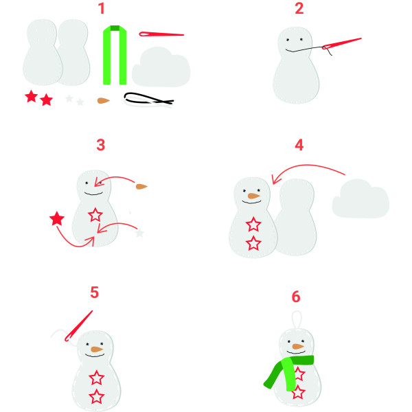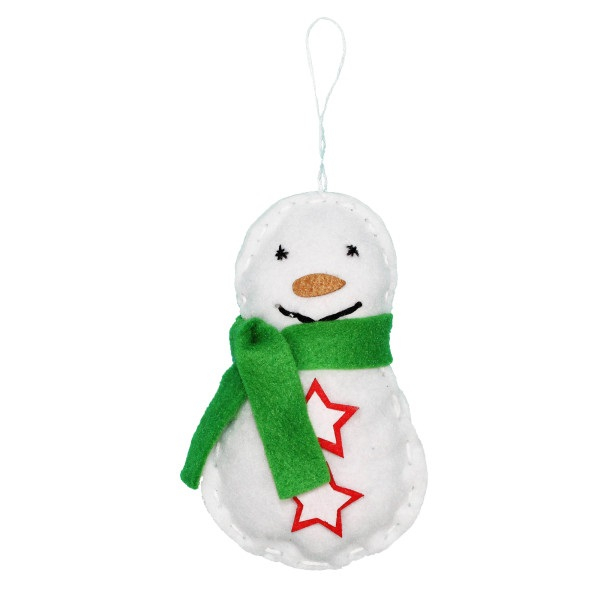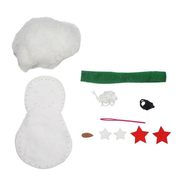 Creează-ți propria figurină din fetru în formă de om de zăpadă folosind toate materialele incluse în acest set creativ: accesorii predecupate din fetru cu marginile perforate, panglică verde (care va fi fularul omului de zăpadă), material moale de poliester pentru umplere, fire de ață, un ac din plastic și instrucțiuni de lucru. O modalitate distractivă de a învăța arta cusutului și de a-ți dezvolta atenția și îndemânarea. Dimensiuni om de zăpadă finalizat: 7 x 12 cm.