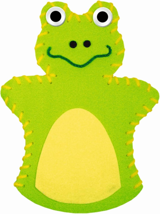 Creează-ți propria marionetă din fetru în formă de broscuță, folosind toate materialele incluse în acest set creativ: accesorii predecupate din fetru cu marginile perforate, de diferite forme și culori, 2 ochi mobili, sârmă plușată, fire de ață, un ac din plastic și instrucțiuni de lucru. O modalitate distractivă de a învăța arta cusutului și de a-ți dezvolta atenția și îndemânarea. Nu conține lipici. După finalizare, marioneta va avea 20 cm înălțime.