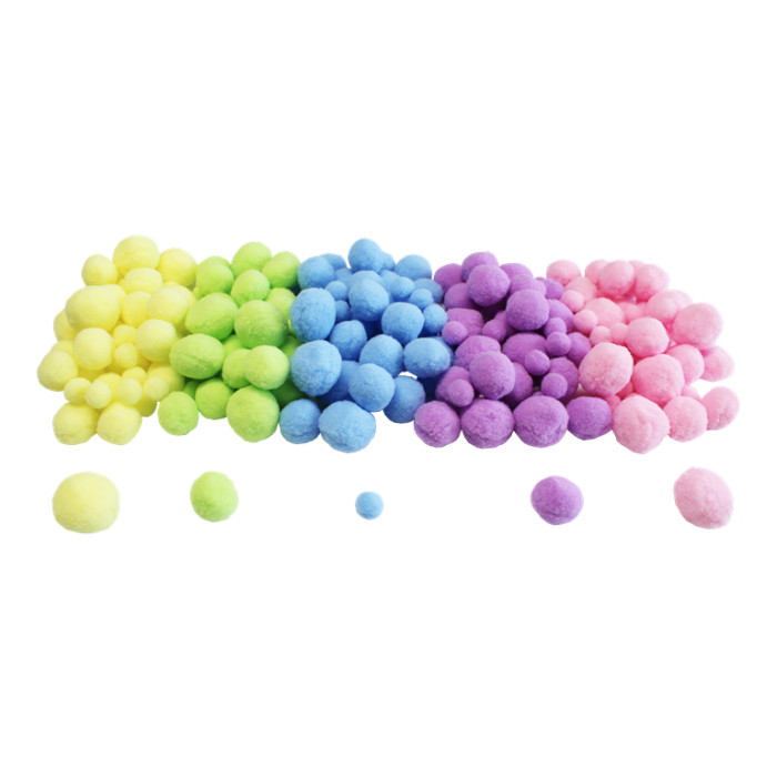 Pufoase, moi și plăcute la atingere, accesoriile pom-pom sunt nelipsite din activitățile de artă și creație. Setul conține 200 de accesorii pom-pom în culori pastelate și în 3 dimensiuni diferite (Ø între 1,5 3 cm).