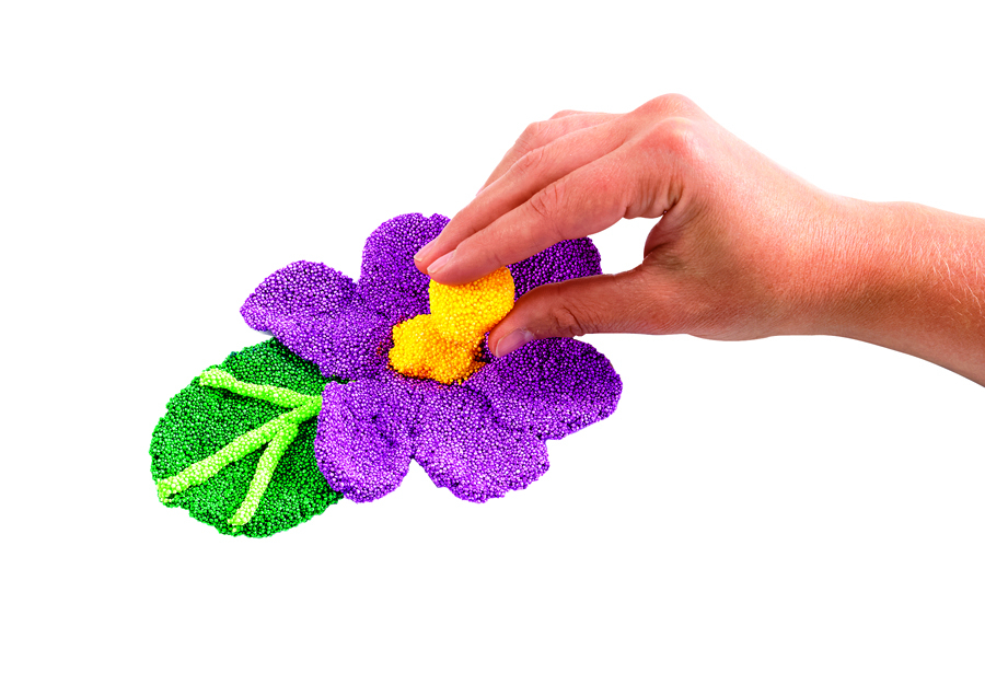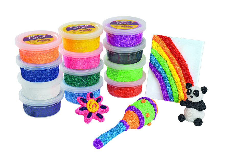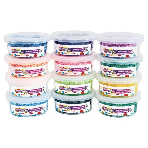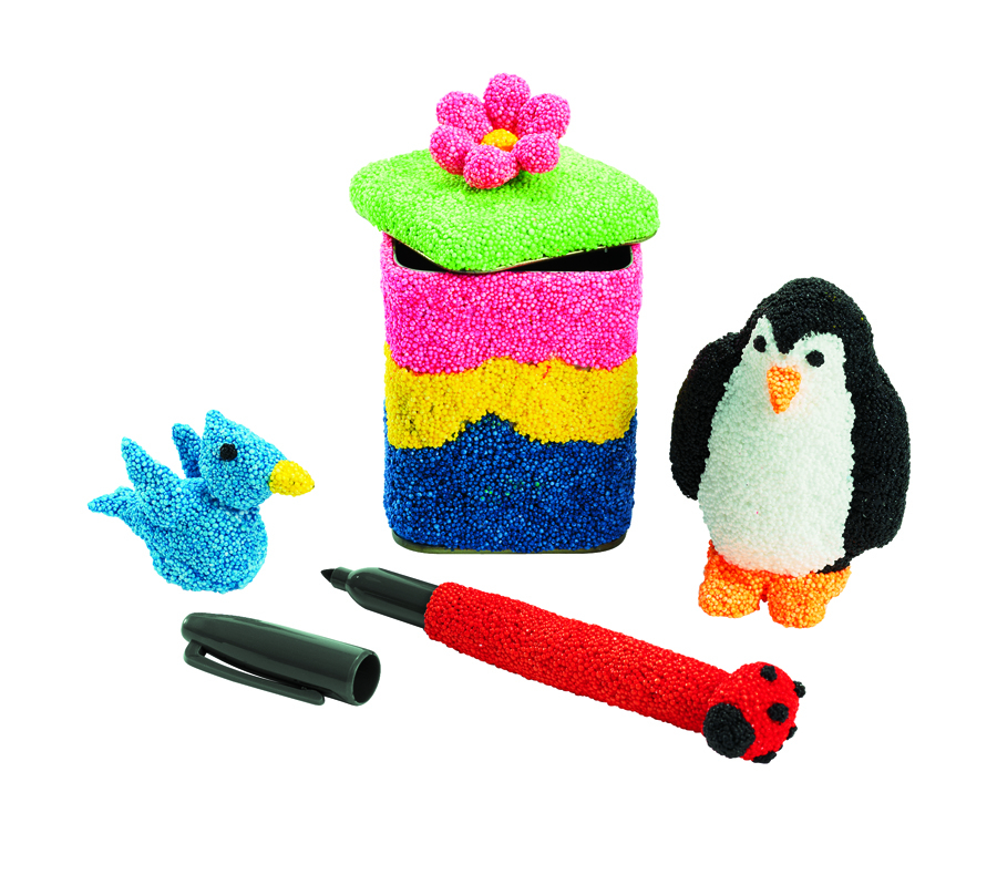 Bobitele de spuma uscata sunt texturate si foarte usor de modelat. În aproximativ 24 de ore dupa ce au fost modelate, acestea se usuca si nu mai pot fi folosite pentru alta forma. Se pot lipi pe suprafete, precum: hârtie, lemn, plastic si metal. Sunt disponibile 12 culori(negru, albastru, verde neon, portocaliu neon, roz neon, violet neon, violet, rosu, alb si galben) x 38 gr. Spuma nu are incluse substante toxice, precum latex, gluten sau soia. Pretul este pentru o bucata.