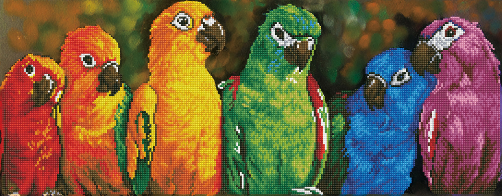 Adu strălucirea diamantelor în casa ta cu acest minunat tablou ce ilustrează șase papagali frumos colorați! Pictura cu diamante este o nouă activitate creativă prin care se realizează tablouri strălucitoare uimitoare cu ajutorul mărgelelor colorate cu aspect de diamante. Tablourile încep să prindă viață odată cu lipirea primelor diamante pe pânza de lucru, fiecare la locul indicat pe schemă, folosind stiloul și ceara incluse în pachet. Pânza de lucru este deja imprimată cu modelul final, ceea ce face ca această activitate să fie facilă și plăcută, la îndemâna oricui. Încearcă pictura cu diamante și vei descoperi o activitate relaxantă, destinată atât adulților, cât și copiilor, din care va rezulta un tablou incredibil de frumos și de strălucitor. Toate materialele necesare sunt incluse în acest set creativ: pânza de lucru cu imagine tipărită și suprafață adezivă, mărgele tip diamante sortate după culori cu simboluri ce corespund cu locul lor pe imagine, o tăviță pentru diamante, un recipient cu ceară specială, un stilou special pentru prinderea și plasarea diamantelor și un ghid ilustrat de instrucțiuni. Pași de lucru în realizarea tabloului cu diamante: 1. Așezați pânza de lucru pe o suprafață plană și îndepărtați folia protectoare de deasupra. Aceasta poate fi îndepărtată integral sau parțial, pe măsură ce aplicați diamantele 2. Alegeți primul simbol de pe pânză, de unde doriți să începeți realizarea tabloului și apoi punguța cu diamantele corespunzătoare și puneți-le în tăvița specială. 3. Deschideți recipientul cu ceară și apăsați cu stiloul în el de câteva ori, apoi prindeți cu stiloul unul din diamantele din tăviță. Acesta se va lipi de vârful stiloului și tot ce trebuie să faceți este să puneți diamantul pe simbolul corespunzător de pe pânza de lucru. Continuați astfel până când tot tabloul este terminat. În cazul în care doriți să întrerupeți temporar activitatea, reatașați folia protectoare pe pânza de lucru, pentru a o proteja de praf. Atenție! Diamantele au dimensiuni mici și nu sunt potrivite pentru copii. Copiii pot lucra numai sub supravegherea strictă a unui adult.
