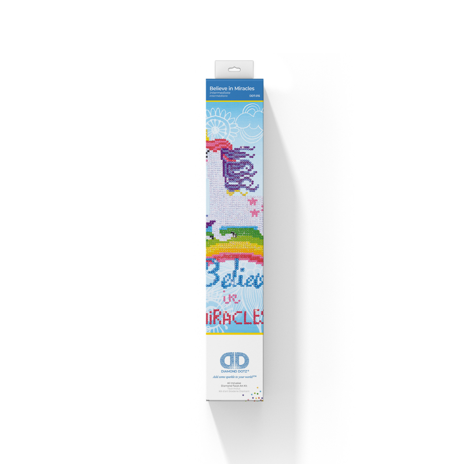 Tablou cu diamante - Unicorn pe curcubeu (Believe in miracles), 35 x 35 cm