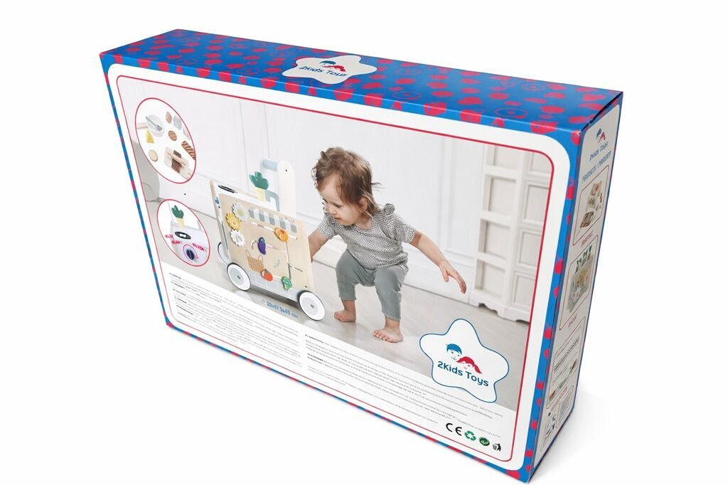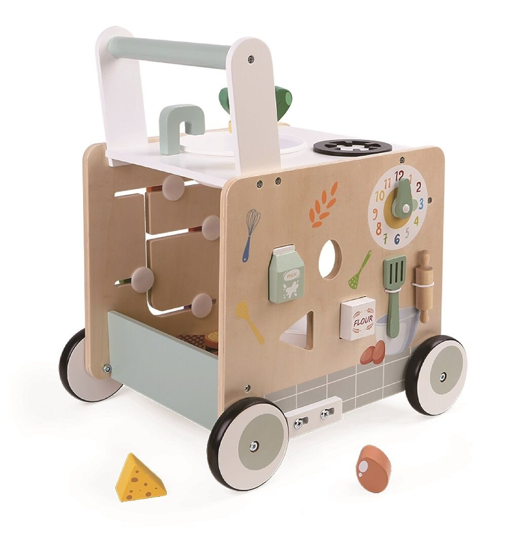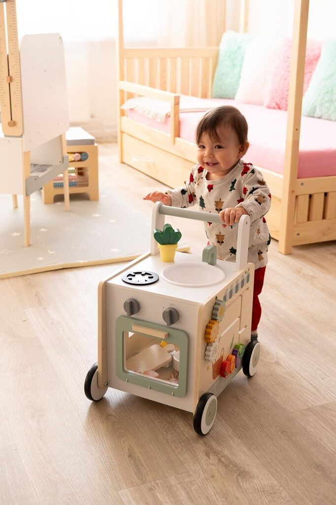 Un ajutor de nădejde pentru primii pași și, în același timp, un spațiu de joacă plin de imaginație pentru micii bucătari în devenire. Acest produs multifuncțional îmbină în mod ingenios rolul unui premergător stabil cu cel al unei bucătării interactive, oferindu-le copiilor ocazia să exploreze lumea în siguranță, în timp ce se joacă. Pe măsură ce învață să meargă, cei mici își pot dezvolta coordonarea și echilibrul, iar numeroasele activități integrate le stimulează creativitatea și motricitatea fină. Premergătorul este echipat cu diverse elemente interactive pe toate laturile, precum sortator de forme cu tematică alimentară, roți zimțate, un labirint cu legume, cuptor cu plită și chiuvetă cu robinet, oferind o experiență de joacă variată și captivantă. Butoanele rotative ale cuptorului produc un sunet plăcut la rotire, adăugând un plus de realism și distracție, iar ușa cuptorului se poate deschide, încurajând jocul de rol. În plus, spațiul de depozitare integrat este ideal pentru păstrarea jucăriilor sau a accesoriilor de bucătărie. Roțile cauciucate asigură o deplasare silențioasă și sigură, iar construcția solidă din lemn, cu un cadru stabil, garantează durabilitate și siguranță în utilizare. Dimensiuni: 33 x 47,5 x 40 cm.