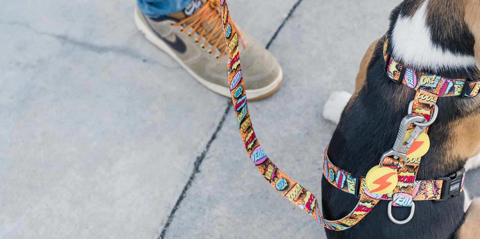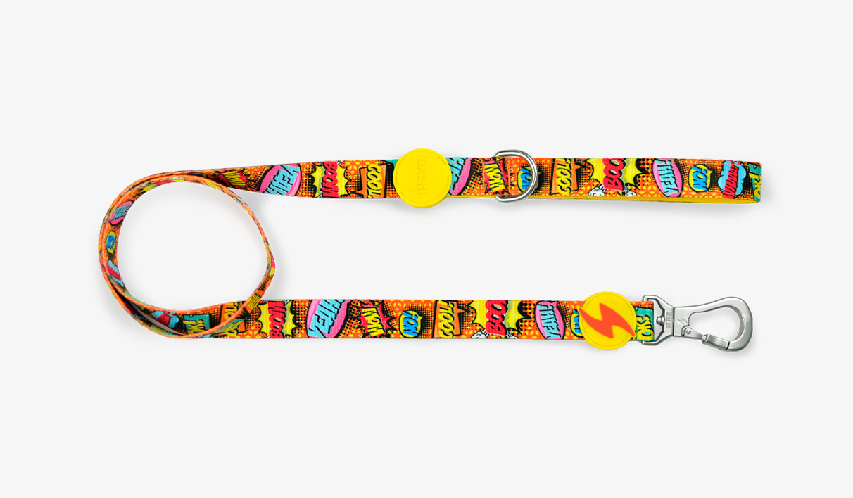 Lesa este realizată din nylon rezistent, oferind durabilitate și siguranță în timpul plimbărilor zilnice. Mânerul este căptușit cu neopren moale, pentru un confort sporit și o prindere plăcută, chiar și în utilizare prelungită. Cârligul rotativ 360° este echipat cu un sistem special de blocare de siguranță, conceput pentru o fixare rapidă și sigură, oferind control maxim în orice situație.