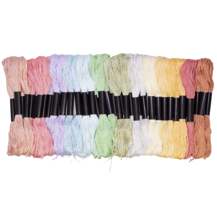 52 de fire de broderie în 13 culori pastelate, ideale pentru pasionații de broderie de toate vârstele, pentru a aduce o notă de eleganță și delicatețe creațiilor. Compuse din mai multe fire, ele pot fi ușor separate pentru a broda modele frumoase. Dimensiunile unui fir: ø 1 mm x 8 m.
