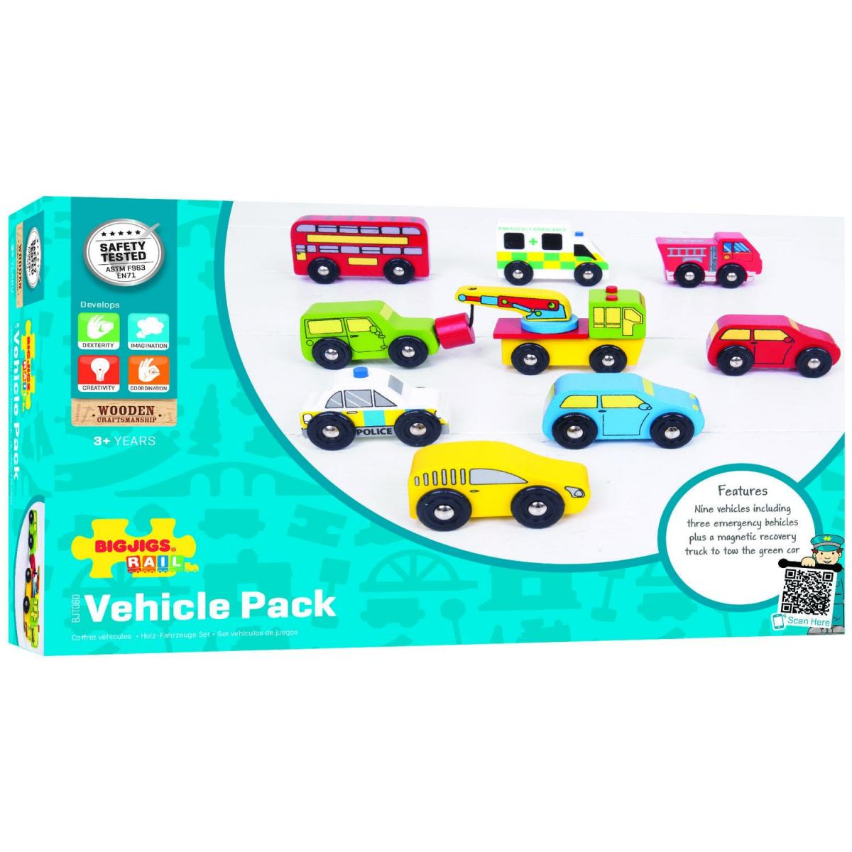 Porniți într-o aventură pe 4 roți, cu acest set de 9 vehicule vesele și colorate. Setul conține: o ambulanță, un autobuz supraetajat, o mașină de pompieri, o mașină de poliție, un camion de tractare, o mașină de teren și 3 mașini mici, toate realizate din lemn certificat FSC® şi compatibile cu sistemele de cale ferată din lemn.