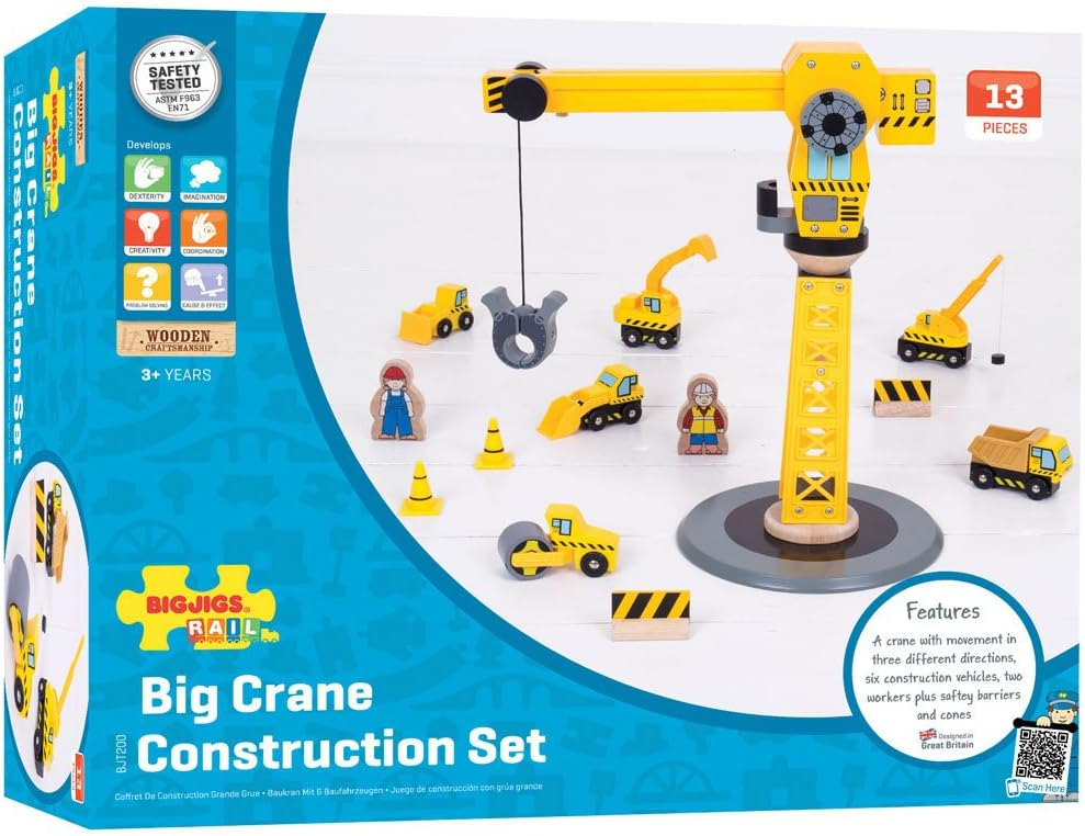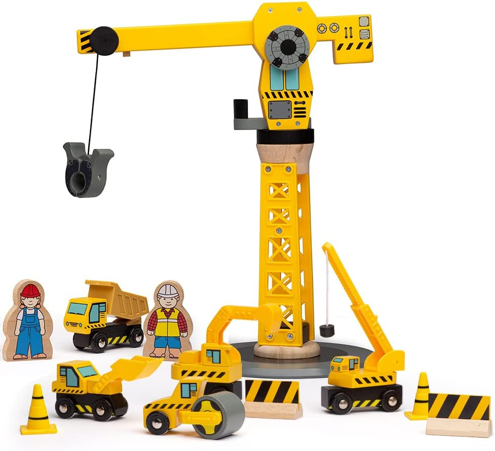 Setul este format din 13 accesorii, toate fabricate din materiale de înaltă calitate, bine finisate, vopsite cu vopsele non-toxice, provenite în mod responsabil, care respectă standardele europene de siguranță actuale. Conține: 1 macara de 38 cm înălțime, 6 utilaje, 2 muncitori, 2 conuri de semnalizare și 2 bariere.