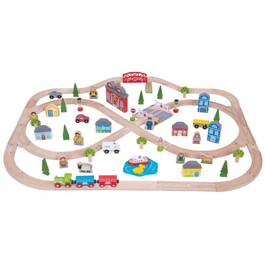 Set-ul conține 101 piese din lemn. Are în componență șine, pod, locomotivă cu vagoane, clădiri, pomi, mașini, vaporaș, trecere la nivel cu calea ferată și figurine oameni și animale. Setul este compatibil cu alte mărci și sisteme de șine din lemn. Fabricat din materiale de înaltă calitate, conform standardelor europene de siguranță actuale. Dimensiuni: 76 x 102 x 10 cm. Vârsta: 3 ani+.