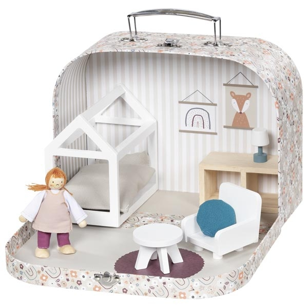 Căsuța portabilă pentru păpuși cu aspect de valiză transformă fiecare moment de joacă într-o aventură creativă. Odată deschisă, valiza se transformă într-un spațiu primitor, plin de mobilier miniatural și accesorii atent realizate, gata să inspire ore întregi de joacă. Mobilierul atent detaliat și păpușa flexibilă inspiră jocuri imaginative și povești nelimitate. Dimensiuni valiză: 25 x 10 x 19 cm.