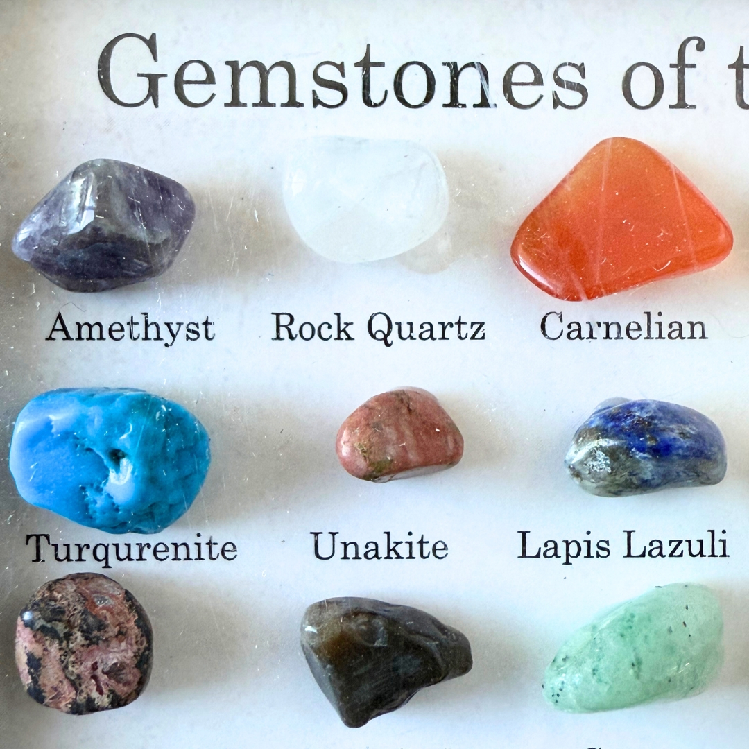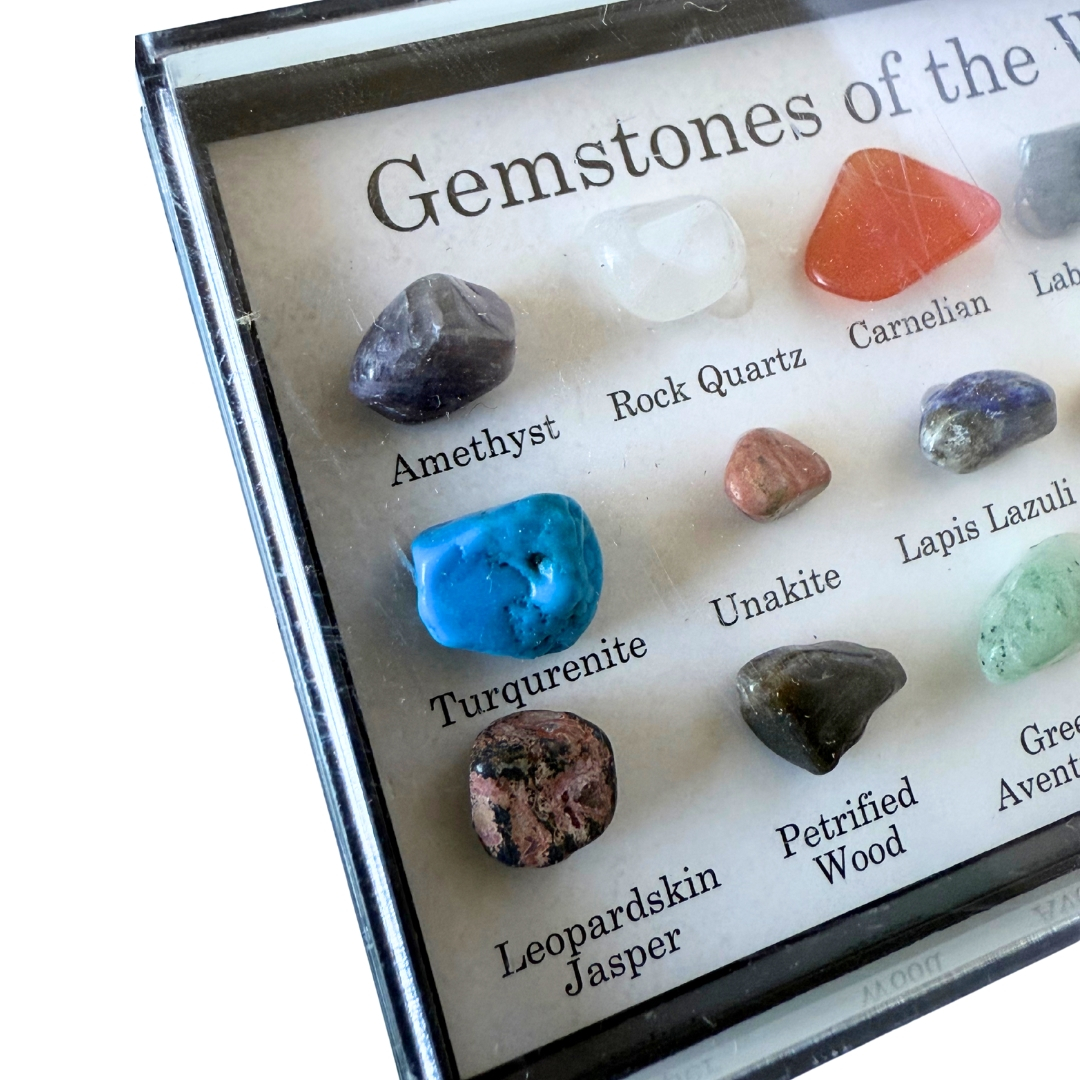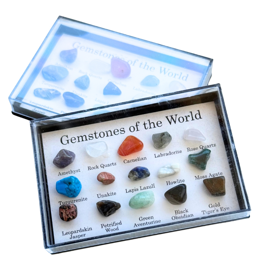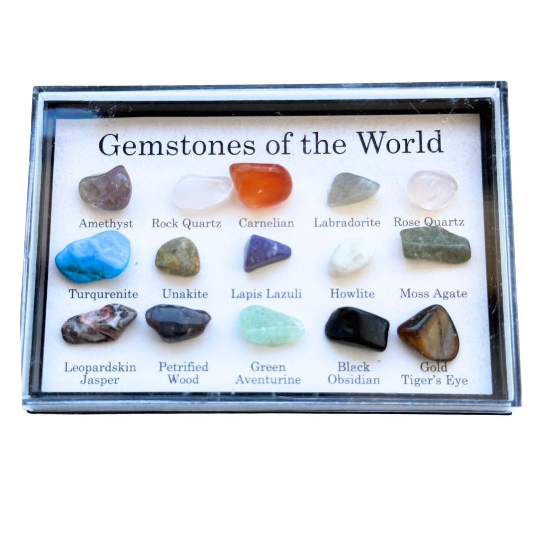 Fiecare piatră spune o poveste despre locul din care provine, despre procesele naturale care au creat-o și despre frumusețea ascunsă în interiorul Pământului. Descoperă minunata lume a pietrelor prețioase cu această selecție minunată și cu totul deosebită de 15 pietre naturale, autentice. Cutia conține: ametist, carneol, cuarț trandafir, cuarț clar (cristal de stâncă), labradorit, howlit, aventurin verde, ochi de tigru auriu și altele. Pentru o identificare ușoară, denumirea este notată sub fiecare piatră. Deoarece pietrele pretioase sunt naturale, culorile si formele acestora pot varia.