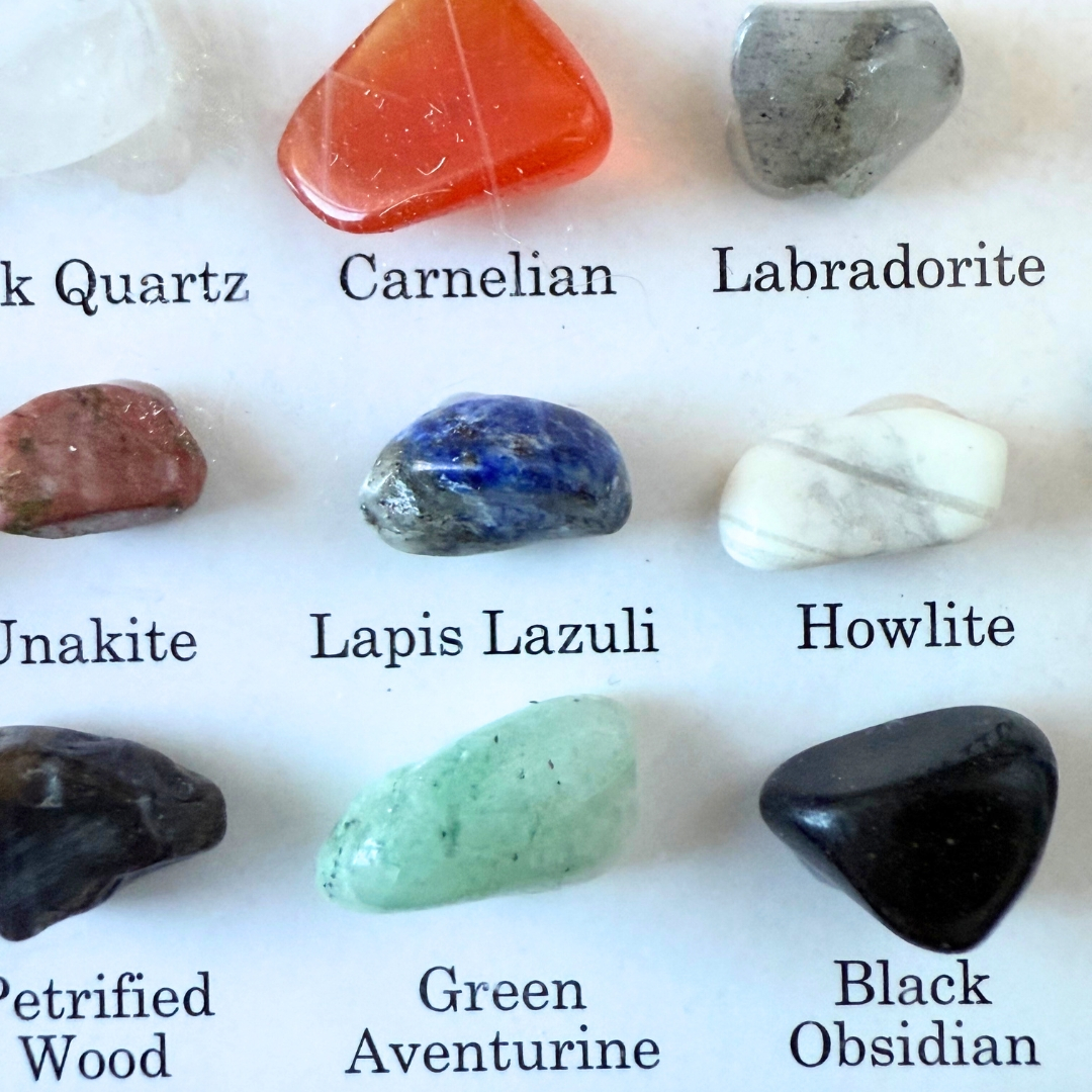 Fiecare piatră spune o poveste despre locul din care provine, despre procesele naturale care au creat-o și despre frumusețea ascunsă în interiorul Pământului. Cutia conține: ametist, carneol, cuarț trandafir, cuarț clar (cristal de stâncă), labradorit, howlit, aventurin verde, ochi de tigru auriu și altele.