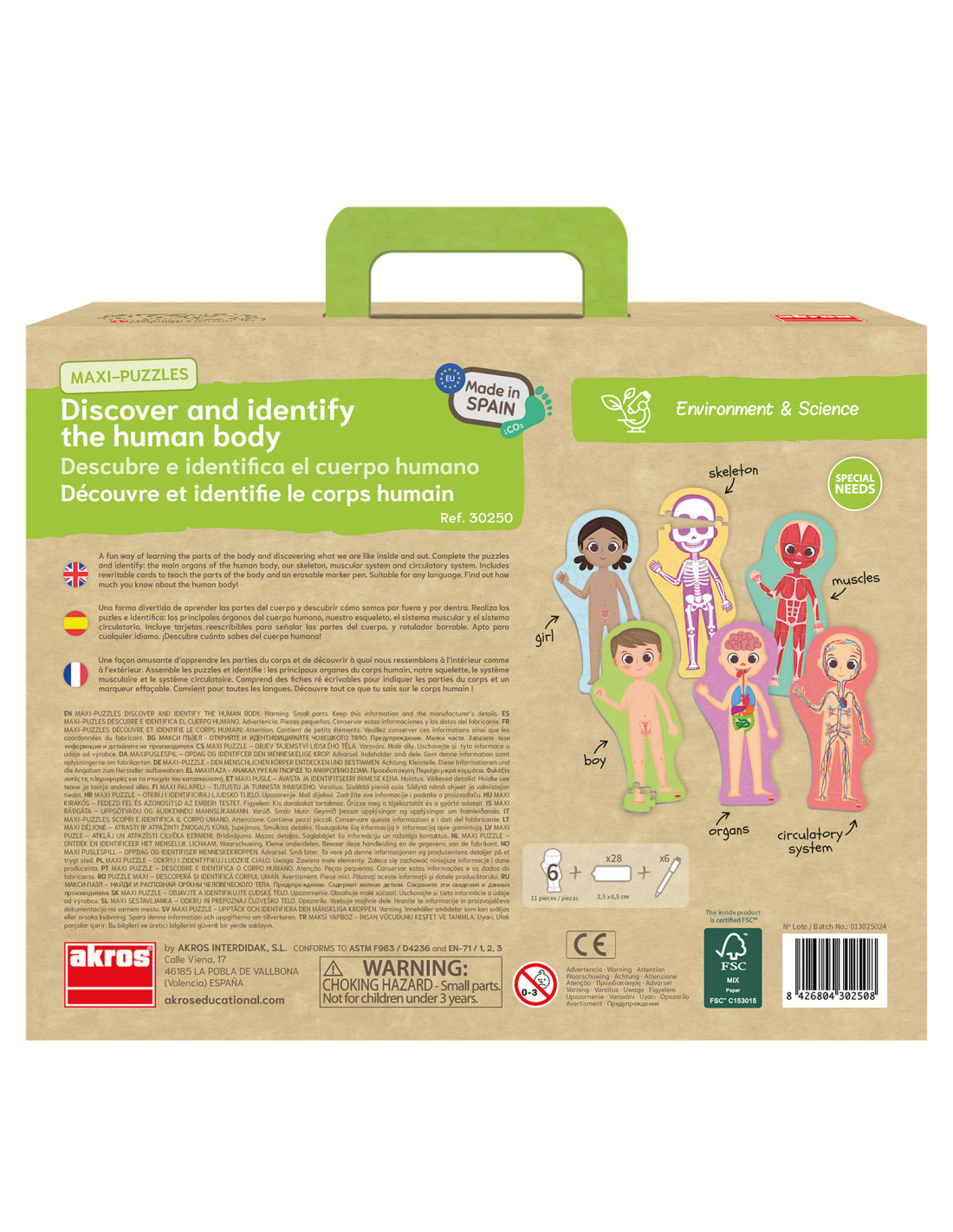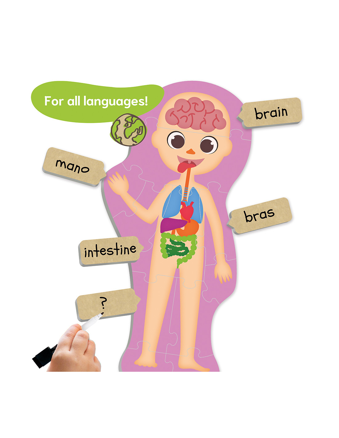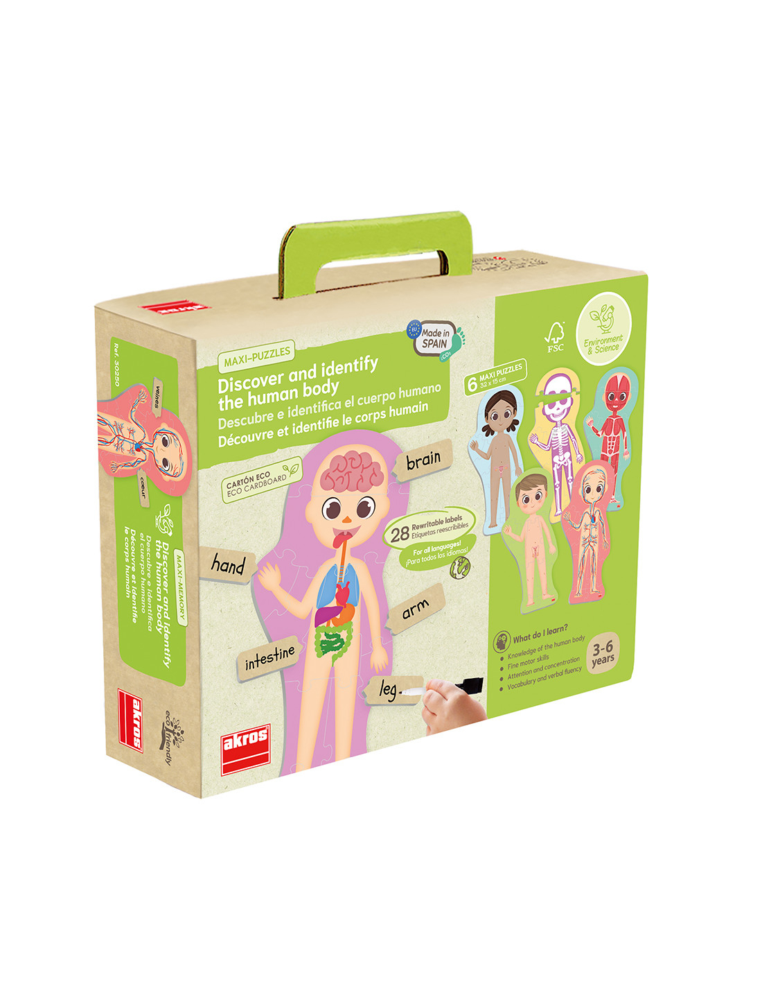 Un mod distractiv de a învăța părțile corpului și de a-l descoperi cum este și în interior și în exterior. Completați puzzle-uri și identificați principalele organe ale corpului uman, scheletul, sistemul muscular și sistemul circulator. Setul conține: 5 puzzle-uri cu siluete, 24 de carduri de 6.5 x 2.5cm și 6 markere de tip scrie-și-șterge.
