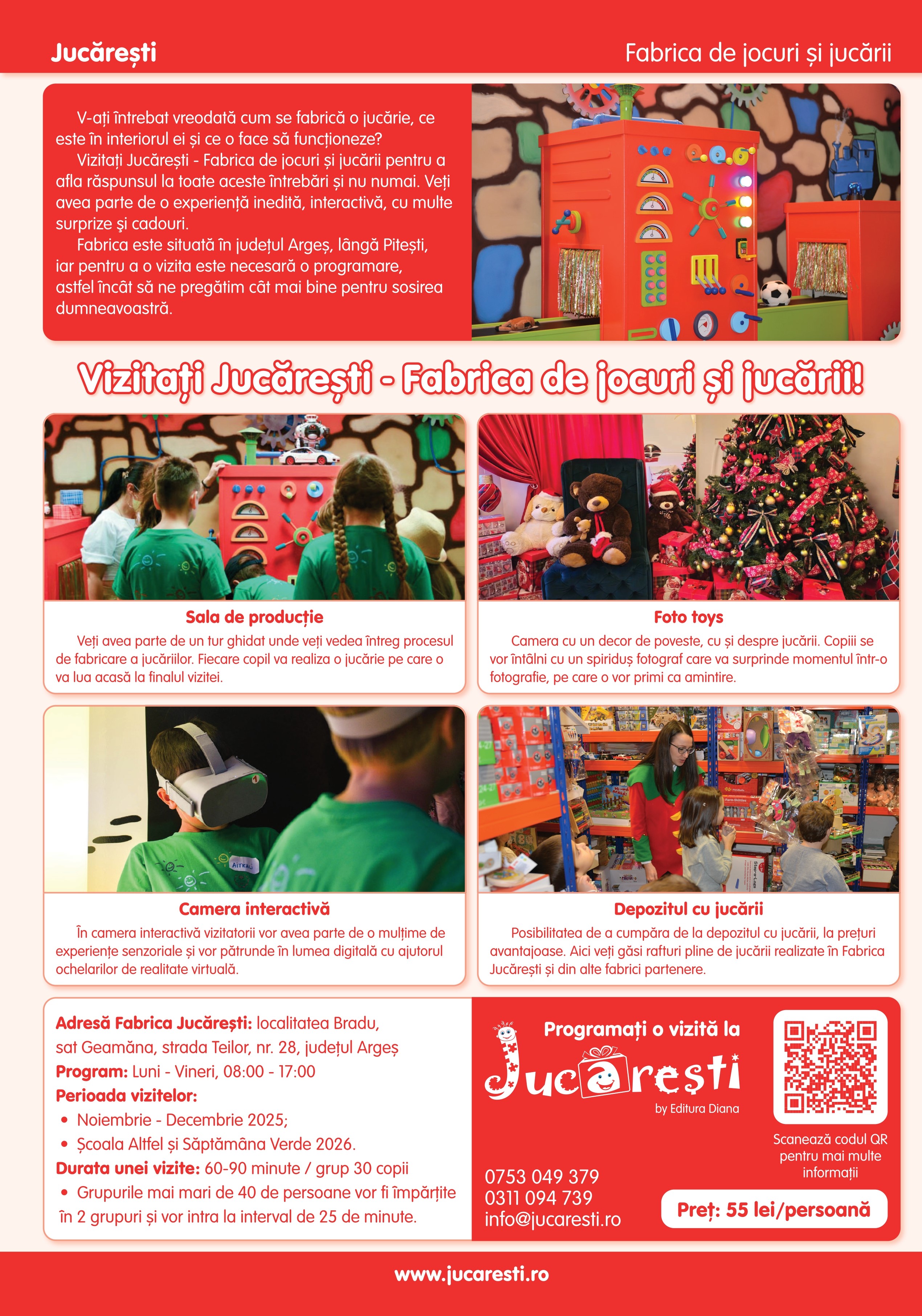 Fabrica de jocuri si jucarii Jucaresti este situata in judetul Arges, langa Pitesti: localitatea Bradu, sat Geamana, strada Teilor nr 28. Programul de vizita este de luni pana vineri, de la 8:00 la 17:00, iar durata unei vizite pentru un grup de 30 de copii este de aproximativ 60-90 minute. Acceptam grupuri de minim 10 copii, cu varsta cuprinsa intre 3 si 12 ani, insotiti de cel putin un adult din partea institutiilor de invatamant. Grupurile mai mari de 40 de persoane vor fi impartite in 2 grupuri mai mici si vor intra in Fabrica Jucaresti la interval de 25 de minute.
