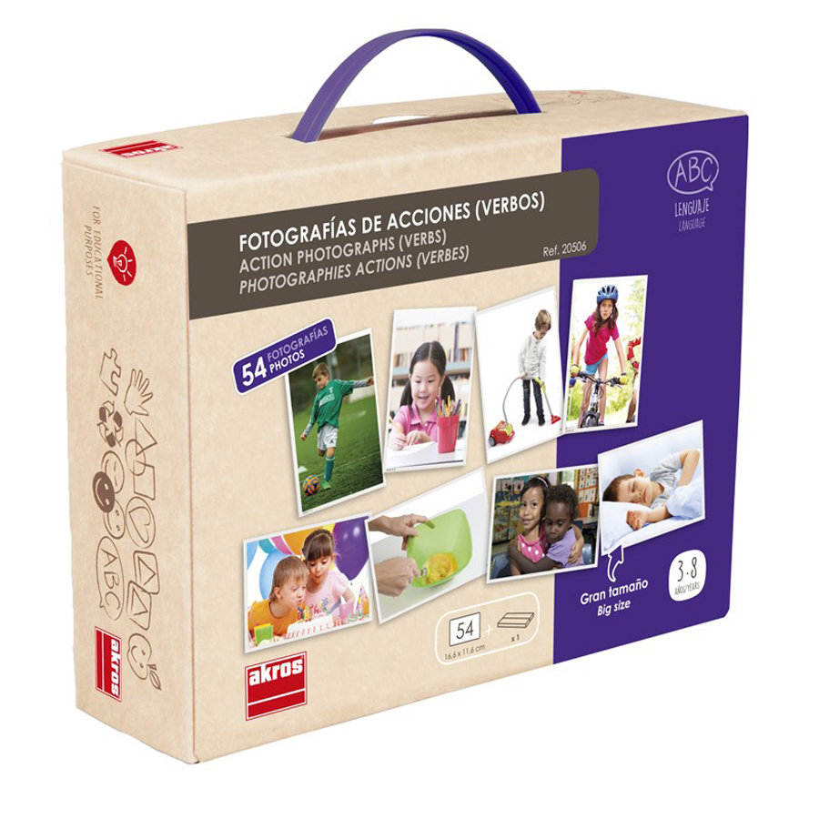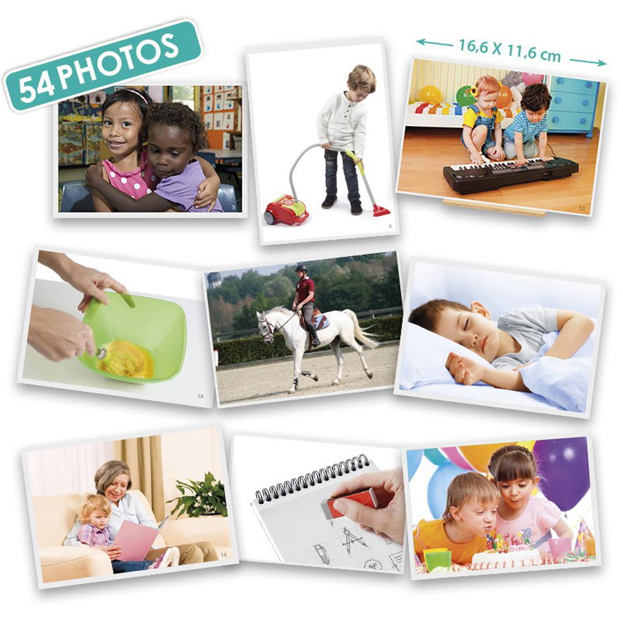 Aceste imagini se folosesc pentru a extinde vocabularul copilului si pentru a-l ajuta sa înteleaga semnificatia descriptiva si relativa a verbelor. Dezvolta capacitatea de observatie si îmbogateste exprimarea verbala. 54 de fotografii în formatul 16,6 x 11,6 cm, care ilustreaza actiuni specifice vietii de zi cu zi, verbe esentiale, prin intermediul unor situatii usor de înteles. Jocul contine un ghid pedagogic. De asemenea, contine un suport pentru fotografii.