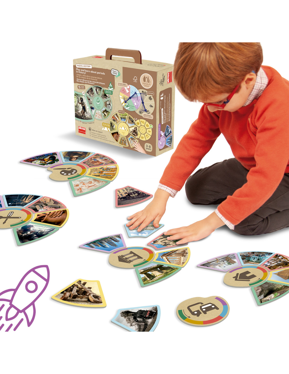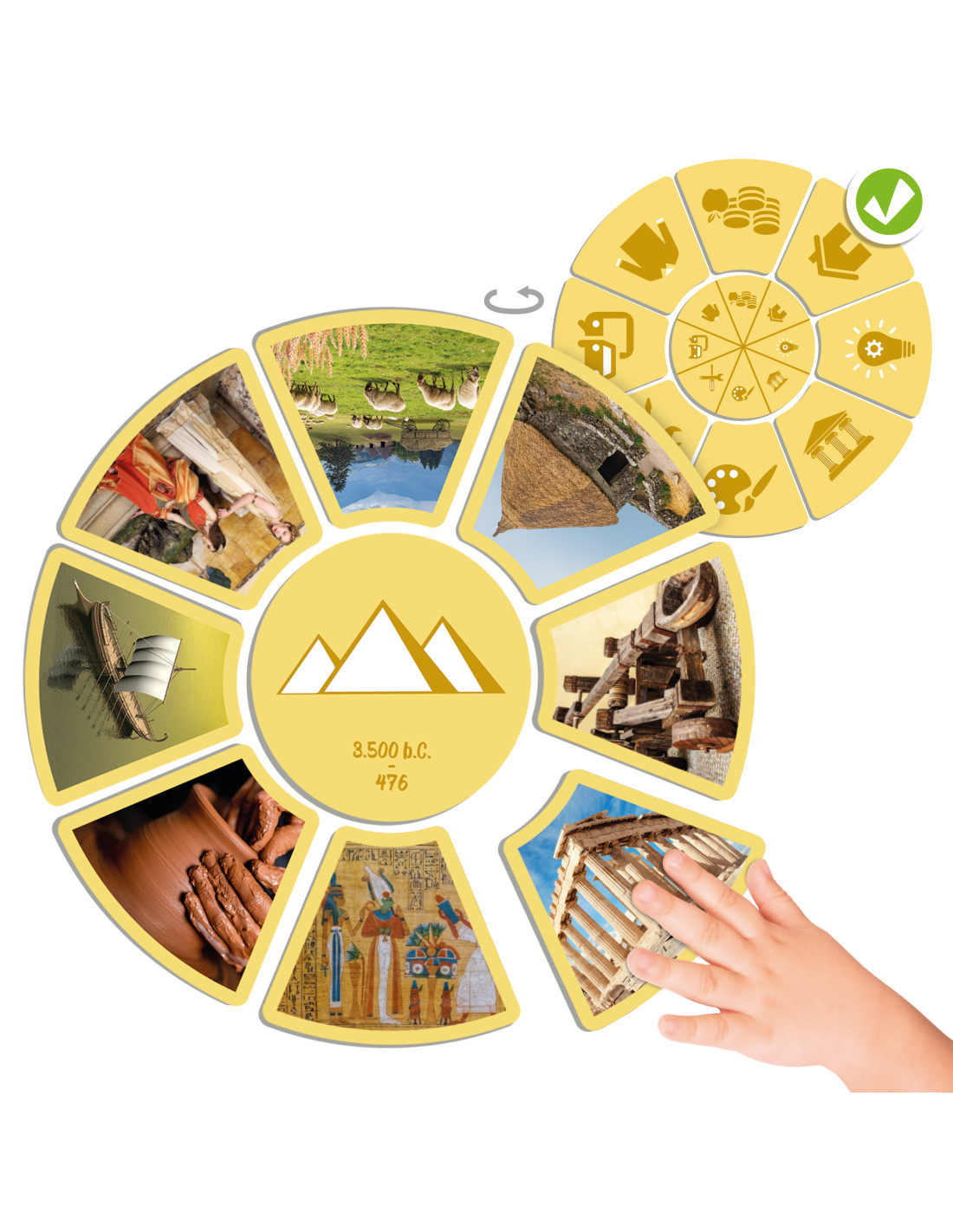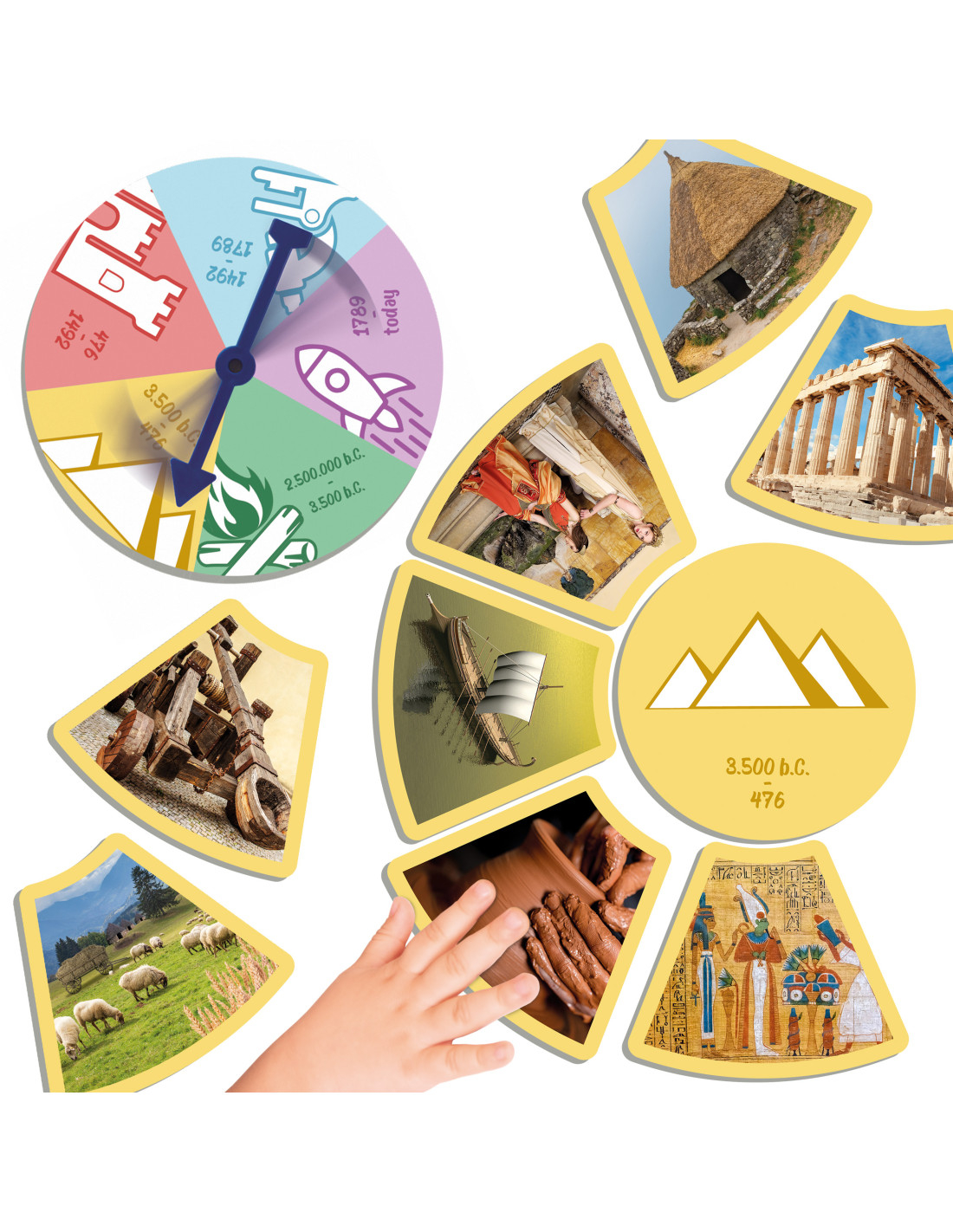 Joc de asociere cu fotografii pentru a descoperi și clasifica caracteristicile sociale, economice și culturale ale fiecărei perioade din istorie. Jocul este compus din: 2 rulete de ø14 cm și 53 de piese mari din carton solid, din care se pot forma diferite puzzle-uri.