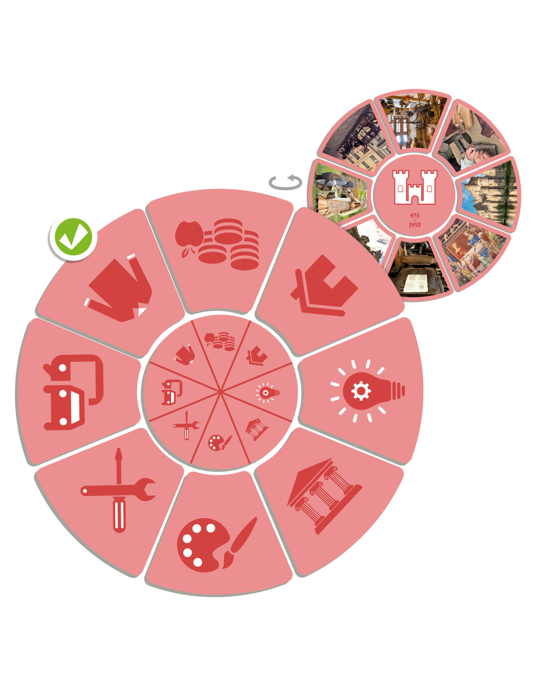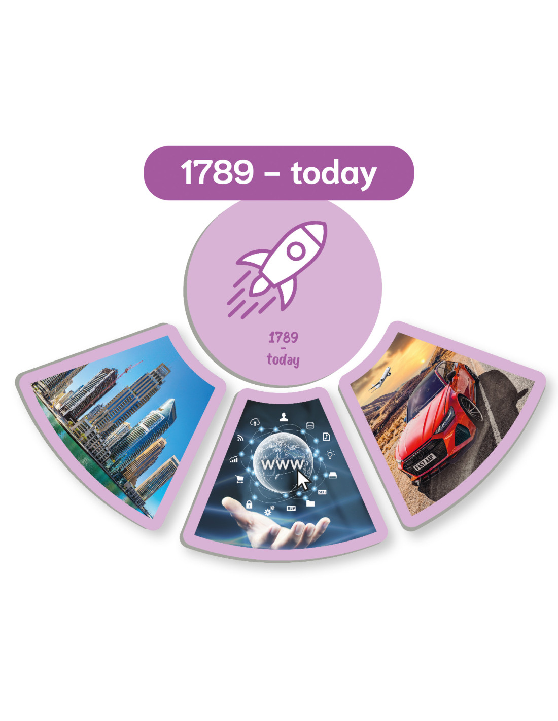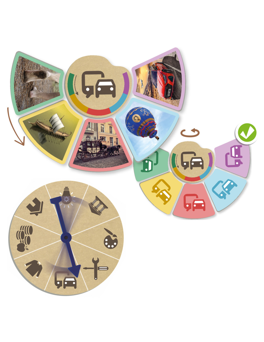 Joc de asociere cu fotografii pentru a descoperi și clasifica caracteristicile sociale, economice și culturale ale fiecărei perioade din istorie. Jocul este compus din: 2 rulete de ø14 cm și 53 de piese mari din carton solid, din care se pot forma diferite puzzle-uri.