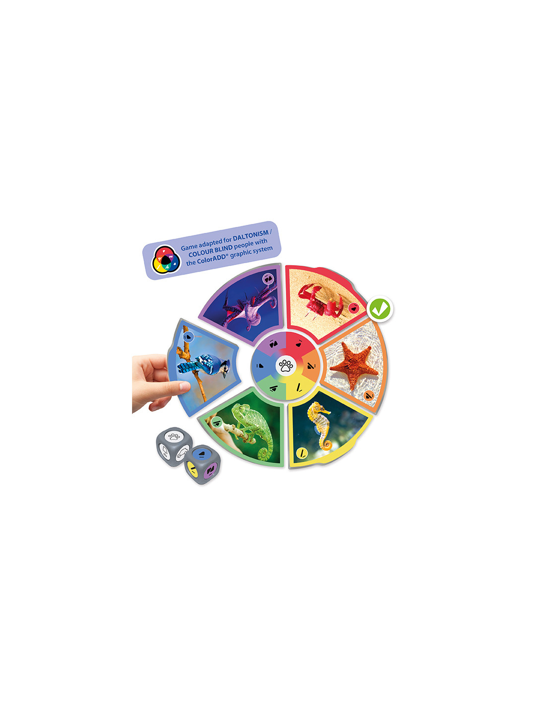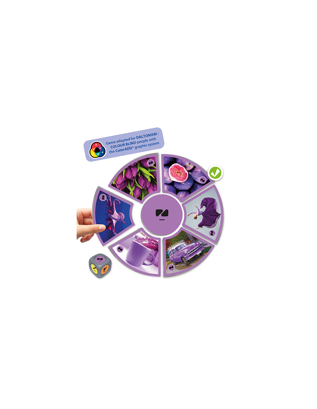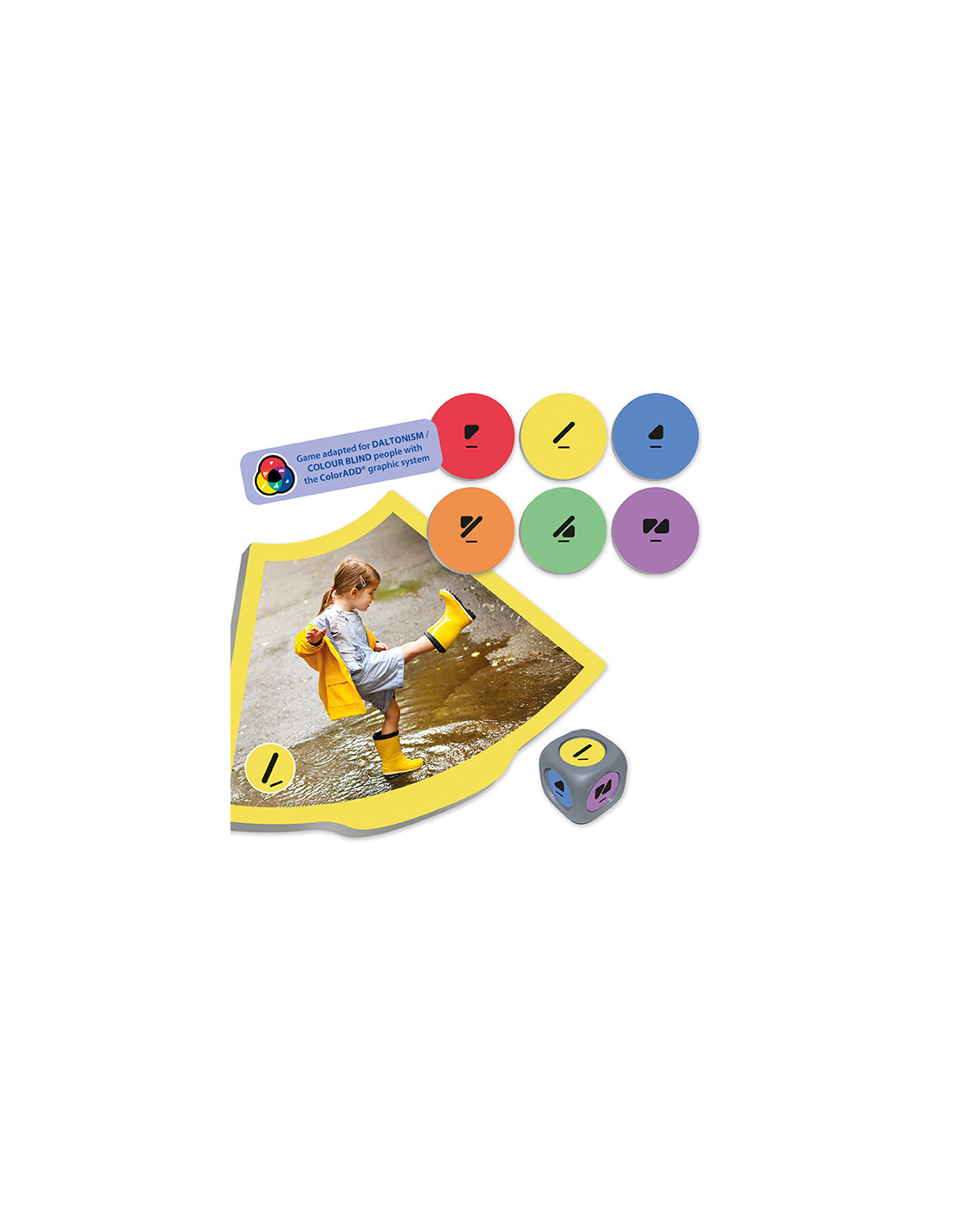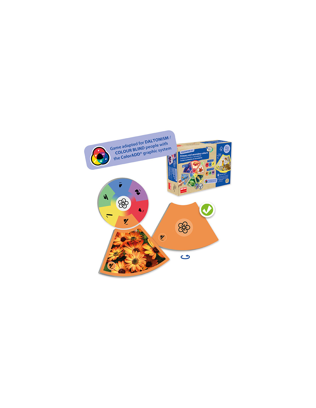 Joc de asociere incluziv pentru descoperirea culorilor primare și secundare. Completați puzzle-urile în funcție de culoarea și simbolul de pe zar. Jocul încurajează incluziunea în clasă/grup. Include sistemul grafic de identificare a culorilor ColorADD® și este potrivit și pentru persoanele cu daltonism. Jocul conține 36 de carduri cu imagini reale, de 10 x 7 cm, 6 carduri rotunde de ø7,5 cm din carton solid și 2 zaruri.