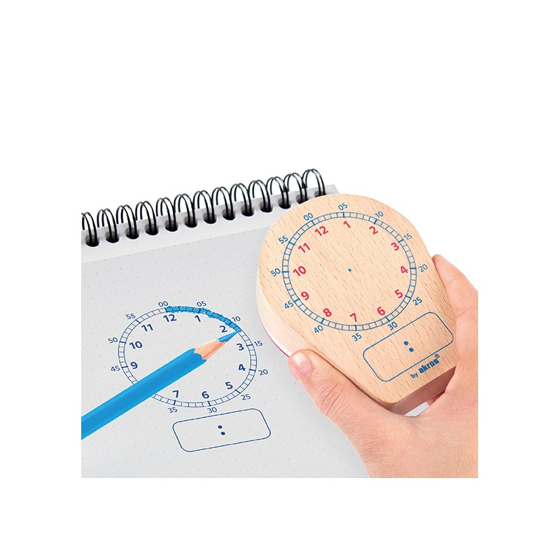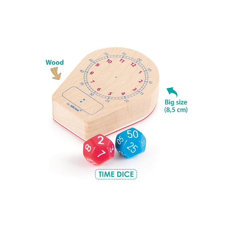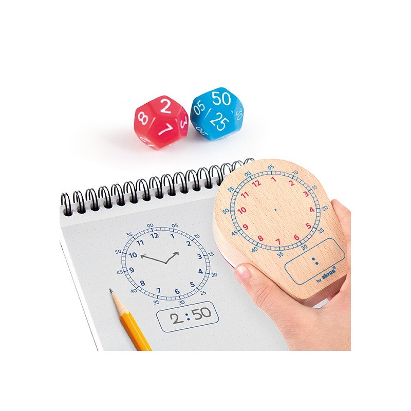 Acest set cu ștampilă și zaruri permite copiilor să practice învățarea ceasului în format digital sau analog, într-o manieră distractivă . Setul include o ștampilă mare, ergonomică, din lemn (8,5 cm lungime) și două zaruri foarte rezistente cu 12 fețe: zarul roșu indică orele de la 1 la 12, iar zarul albastru minutele, la intervale de 5 minute.