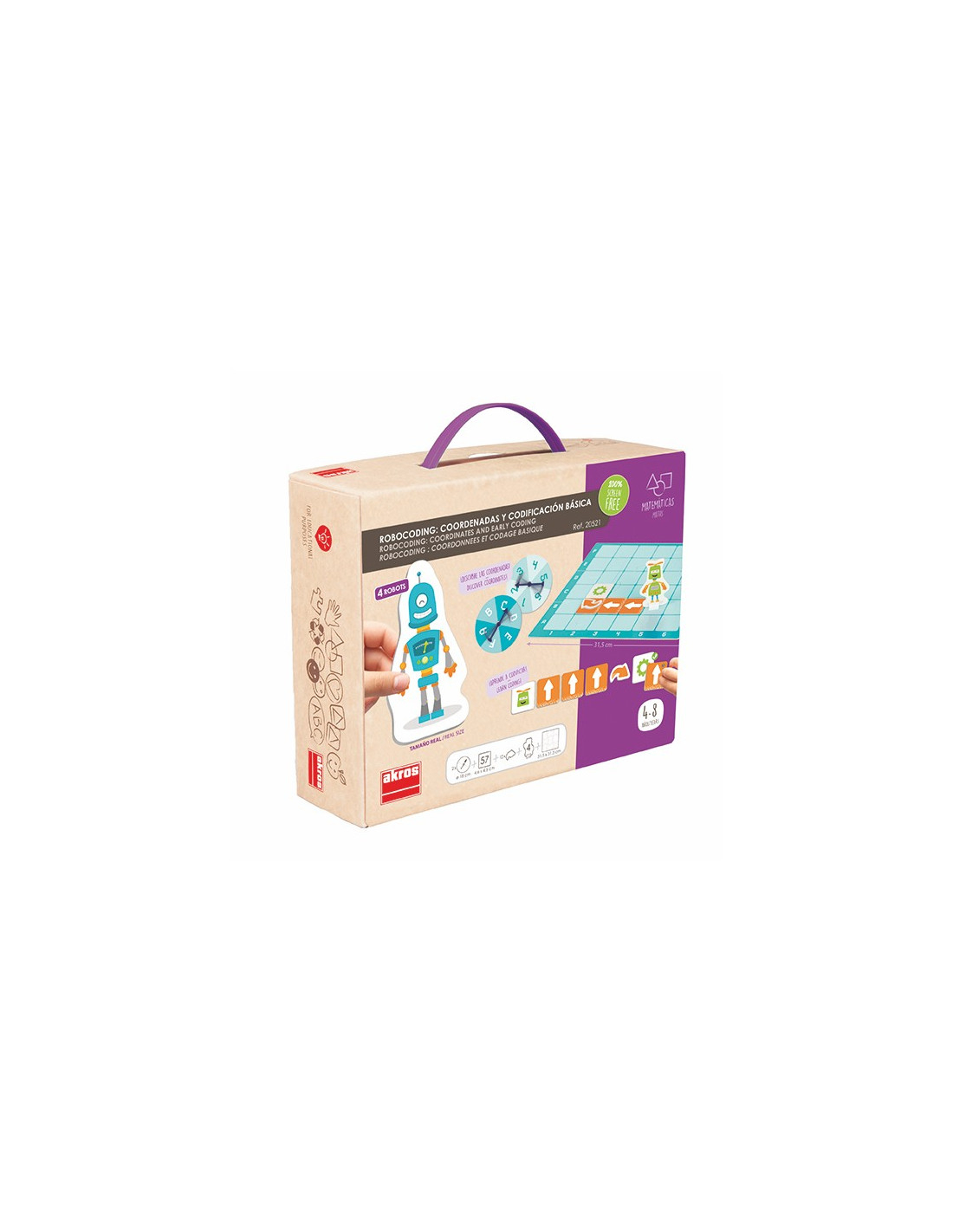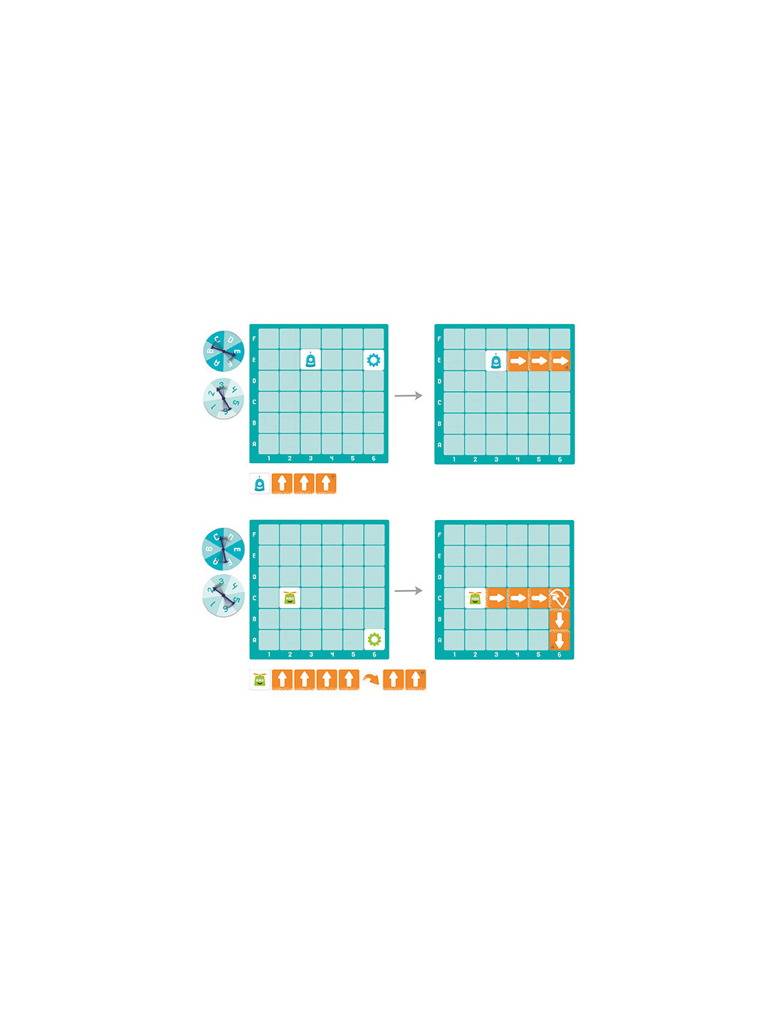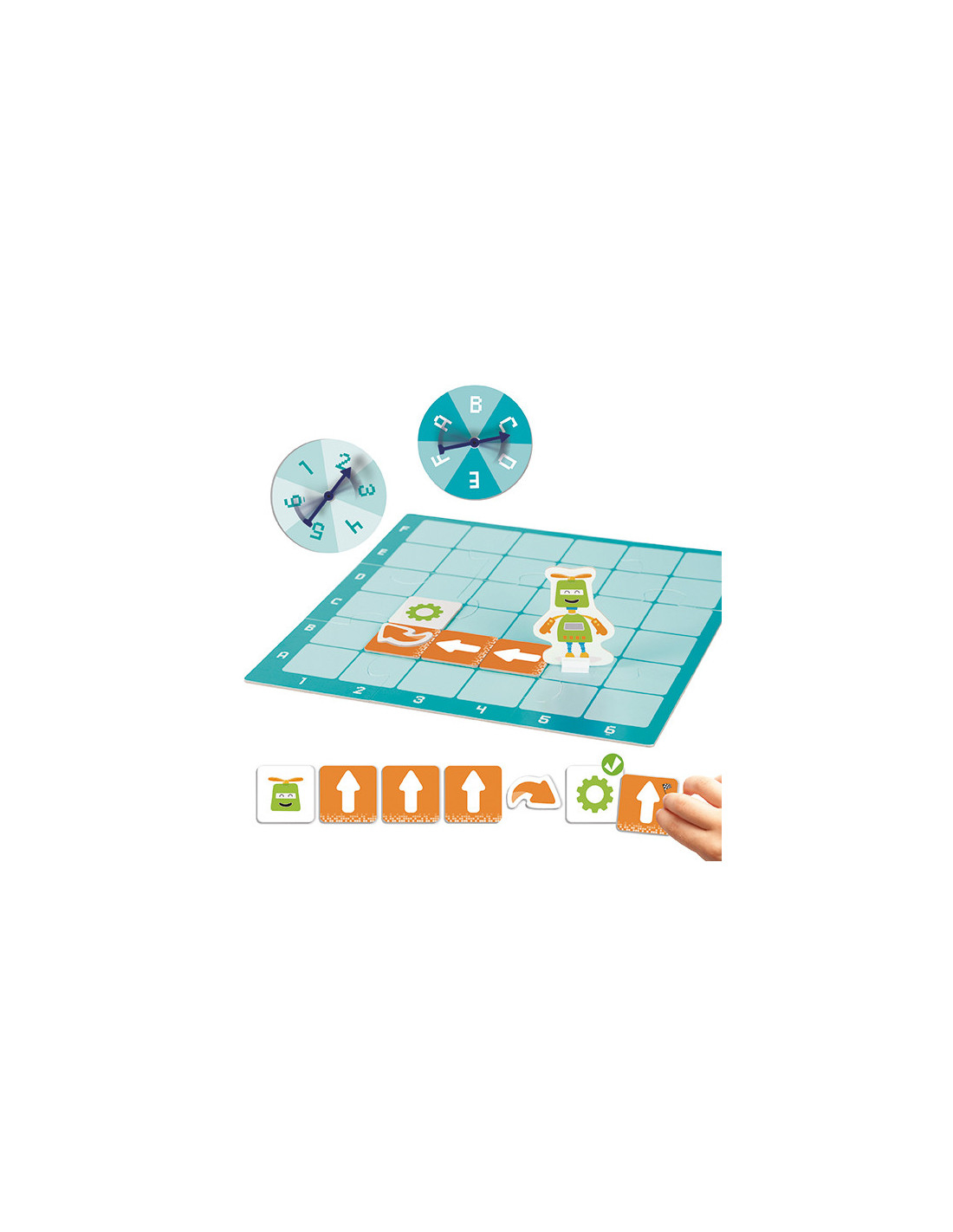 Programare fără computer? Este cel mai bun mod de a începe! Rotiți roțile ruletei și puneți roboții pe tablă. Aflați despre coordonate și primele concepte de programare timpurie. Descoperiți cum orice provocare poate fi împărțită într-o succesiune de pași mai mici. Creați aceste secvențe de mișcări împreună cu prietenii dvs. într-un mod cooperativ și veți afla că există diferite moduri de a atinge același obiectiv. Jocul conține: 1 tablă de joc din carton, de 31 x31 cm, 57 de carduri pătrate (4,6 x 4,6 cm), 12 carduri în formă de săgeți, 2 rulete cu diametrul de 10,5 cm și 4 roboței din carton cu suport.
