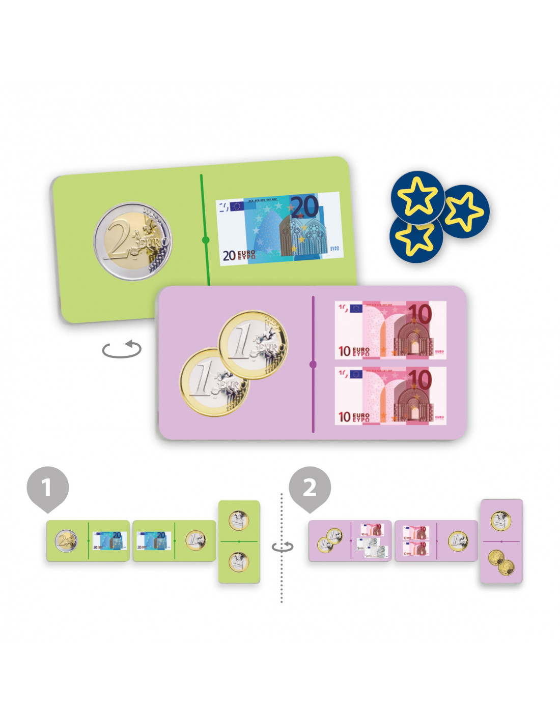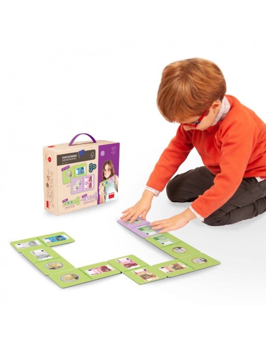 Un mod distractiv de a învăța despre bancnotele și monedele euro prin asocieri simple. În plus, acest joc cu piese de dimensiuni mari îi ajută pe copii să se familiarizeze cu schimbul valutar.