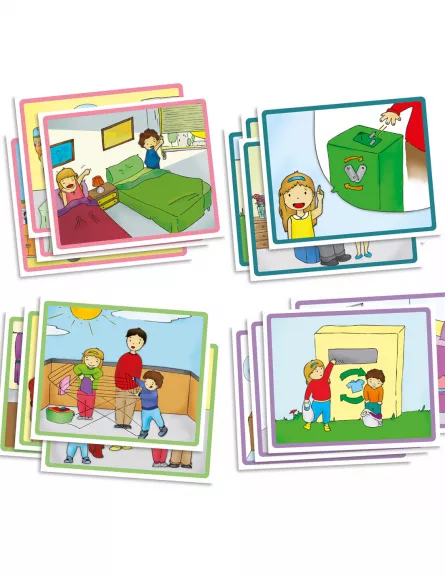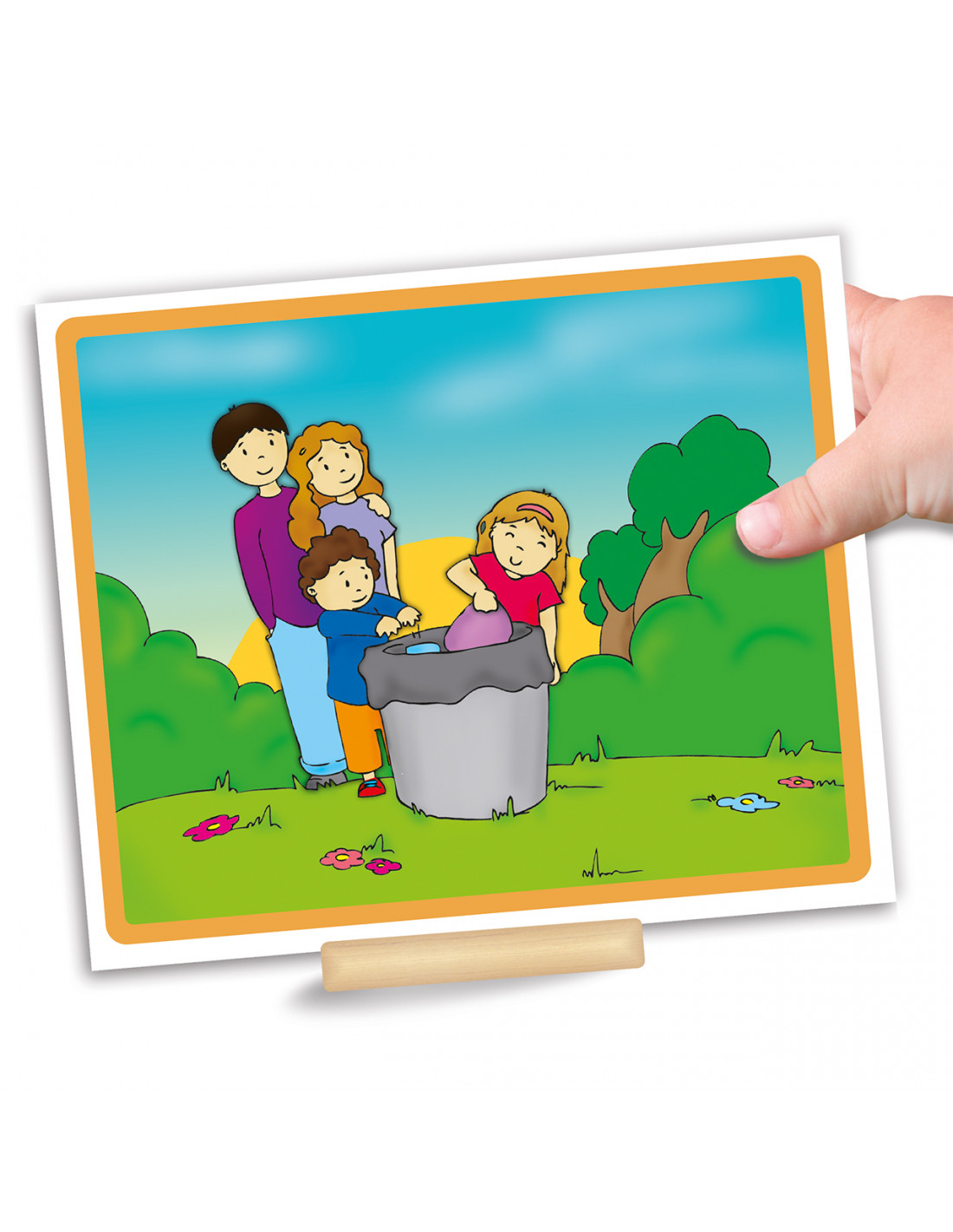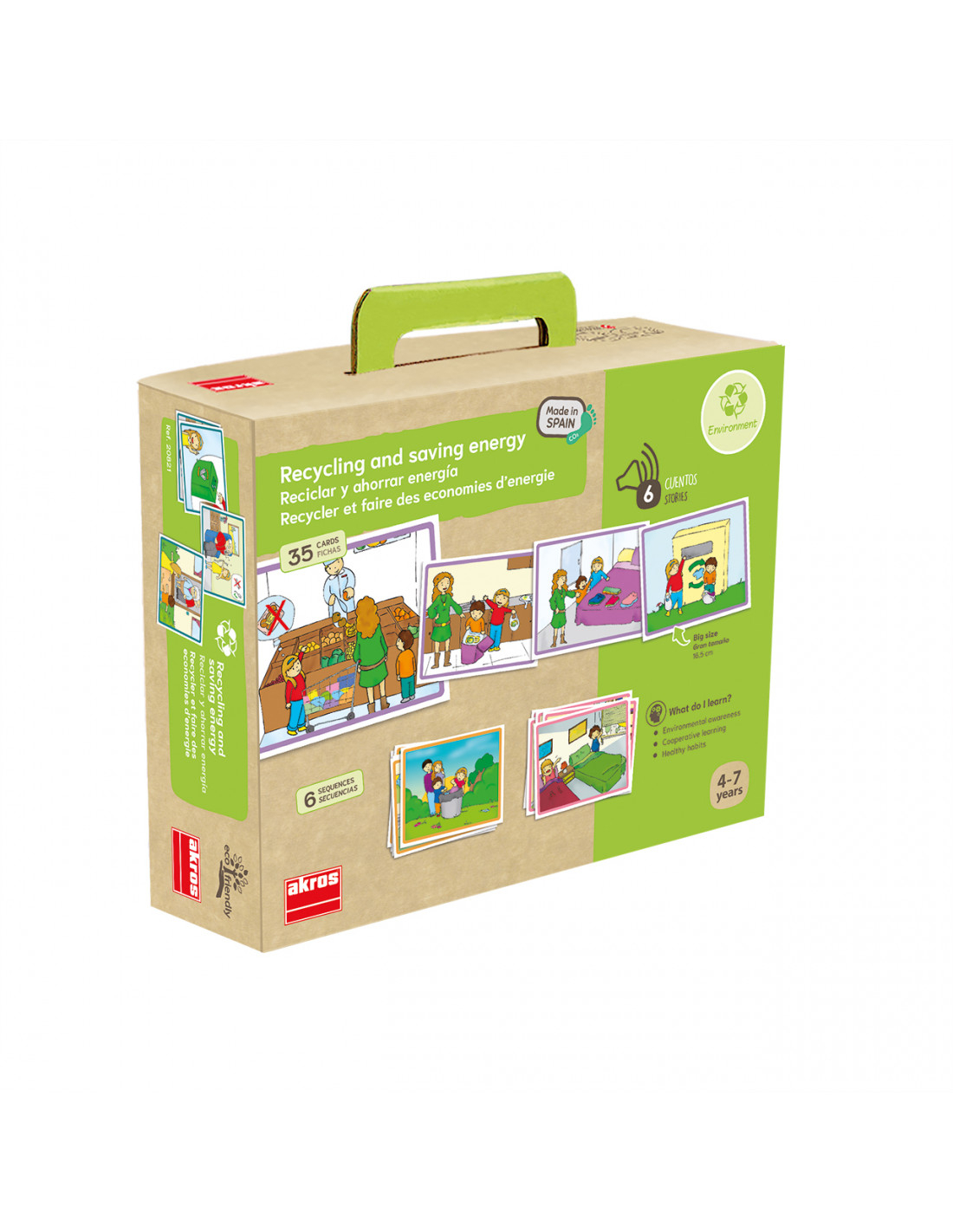 Contine 6 povesti amuzante care nareaza aventurile a doi frati ce învata metode simple de reciclare si economisire a energiei. Fiecare poveste este formata din 5 fise ilustrate care trebuie ordonate folosind schema povestii de pe CD. Obiective psiho-pedagogice: învatarea de obiceiuri de comportament corect privind aspectele legate de pastrarea si protejarea Planetei; dezvoltarea aptitudinilor de ascultare; învatarea notiunilor temporale (înainte, dupa, apoi,...); stimularea si îmbogatirea limbajului; îmbogatirea vocabularului si asimilarea de structuri lingvistice complexe; facilitarea învatarii altor limbi. Include: 30 de fise (ilustratii) de 13,5 x 16,5 cm cu expunerea a 6 povesti (5 cartonase pentru fiecare poveste); 1 CD AUDIO MP3 cu naratiunea a 6 povesti amuzante în diferite limbi (CD-ul contine si textele povestii si ilustratiile în alb si negru pentru a colora); 5 suporturi din lemn; 1 Ghid pentru utilizarea CD-ului