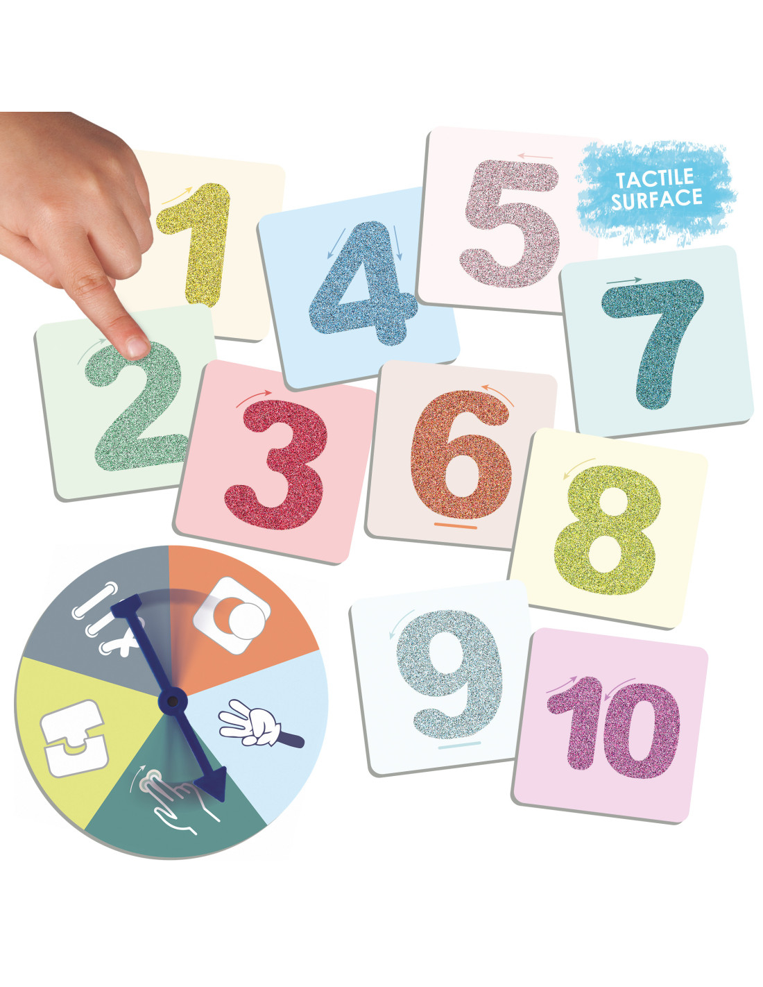 Descoperiți numerele folosind simțurile într-un mod creativ. Învârtind săgețile celor 2 rulete, cei mici trebuie sa accepte provocarea numerelor: îmbină piesele de puzzle pentru a forma un număr, conturează numărul cu șnurul, citește prin atingere (conturează numărul utilizând un singur deget), numără obiectele sau