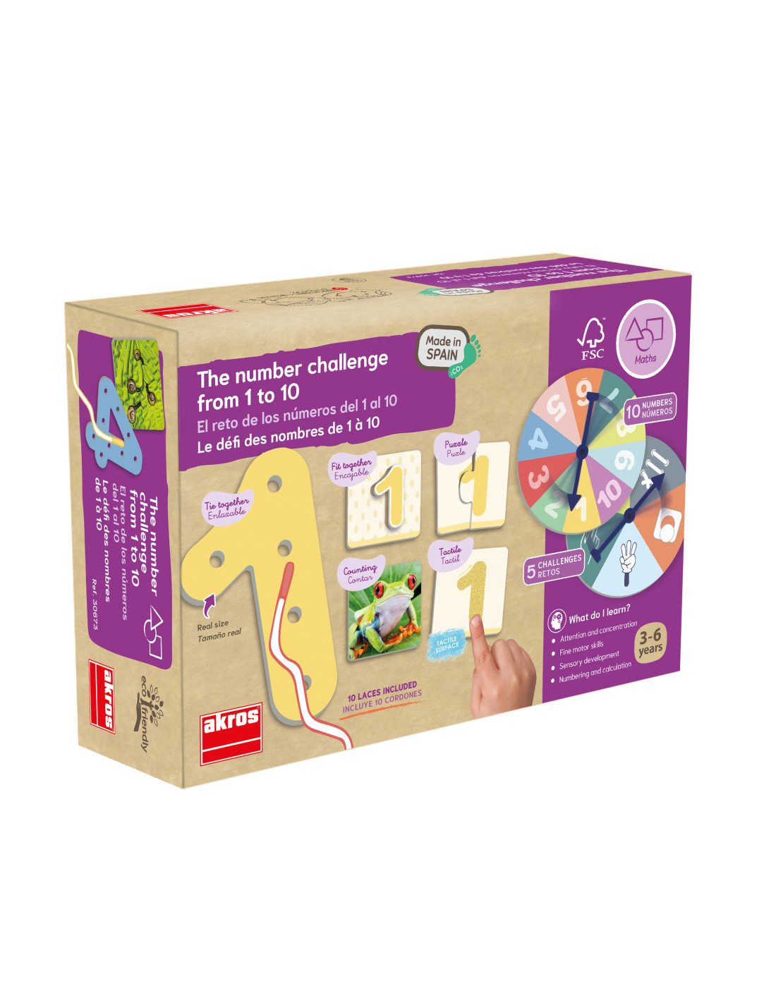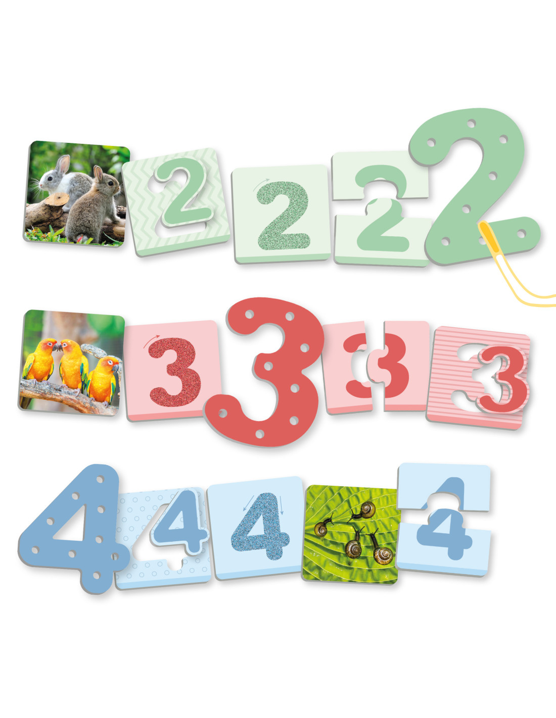carduri cu suprafață aspră și 10 carduri cu imagini din viața reală), 2 rulete, 10 numere mari care se pot lega între ele și 10 șnururi ergonomice de diferite culori.