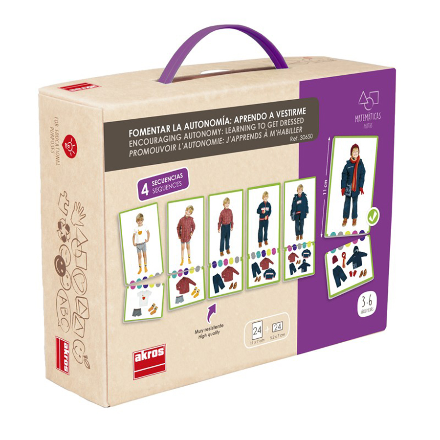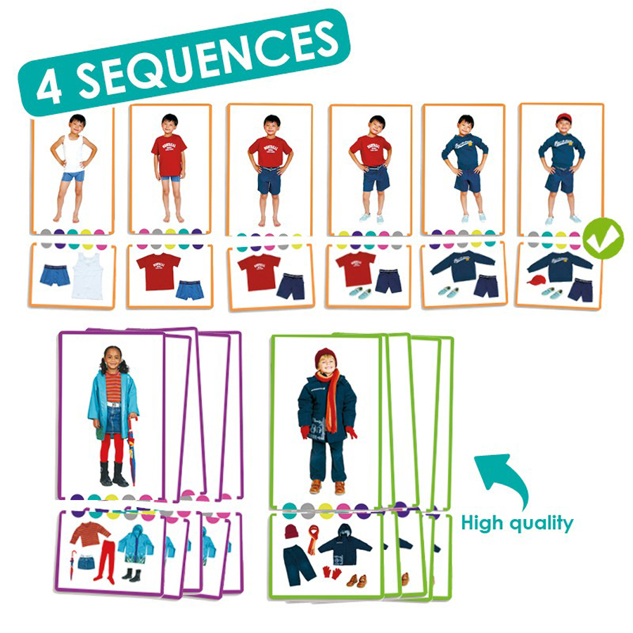 Un joc prin care copiii învata despre anumite tipuri de îmbracaminte caracteristice anotimpurilor, respectiv despre ordinea potrivita a îmbracarii. Contine: 24 de carduri cu fotografiile copiilor (dim. 11 x 7 cm) si 24 de carduri cu articole vestimentare (5,2 x 7 cm).