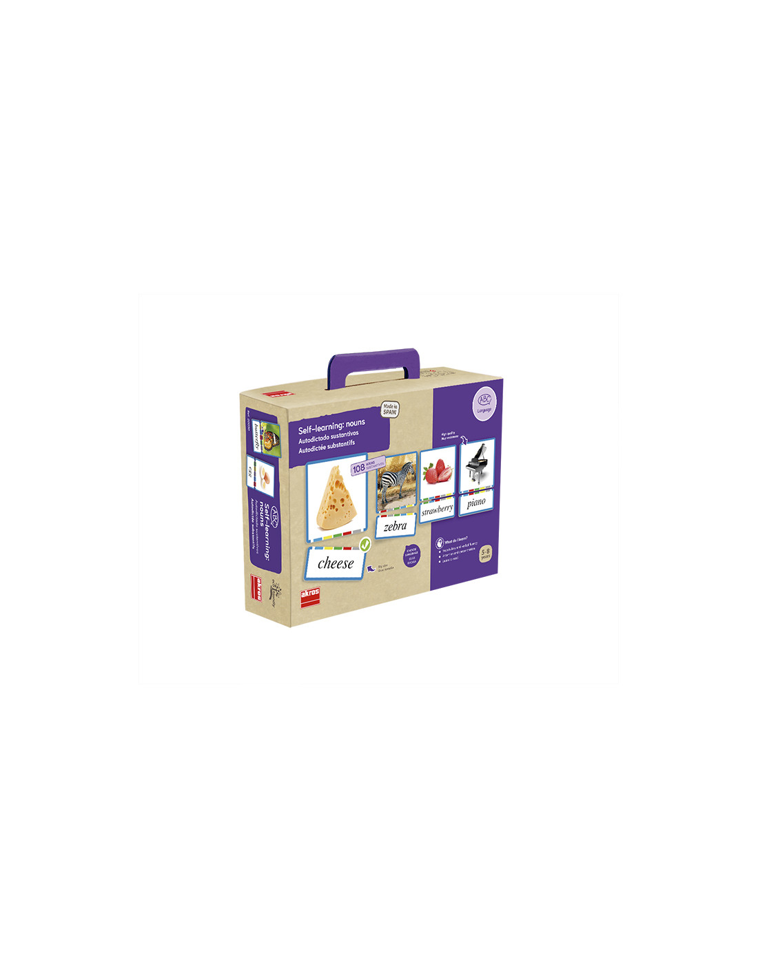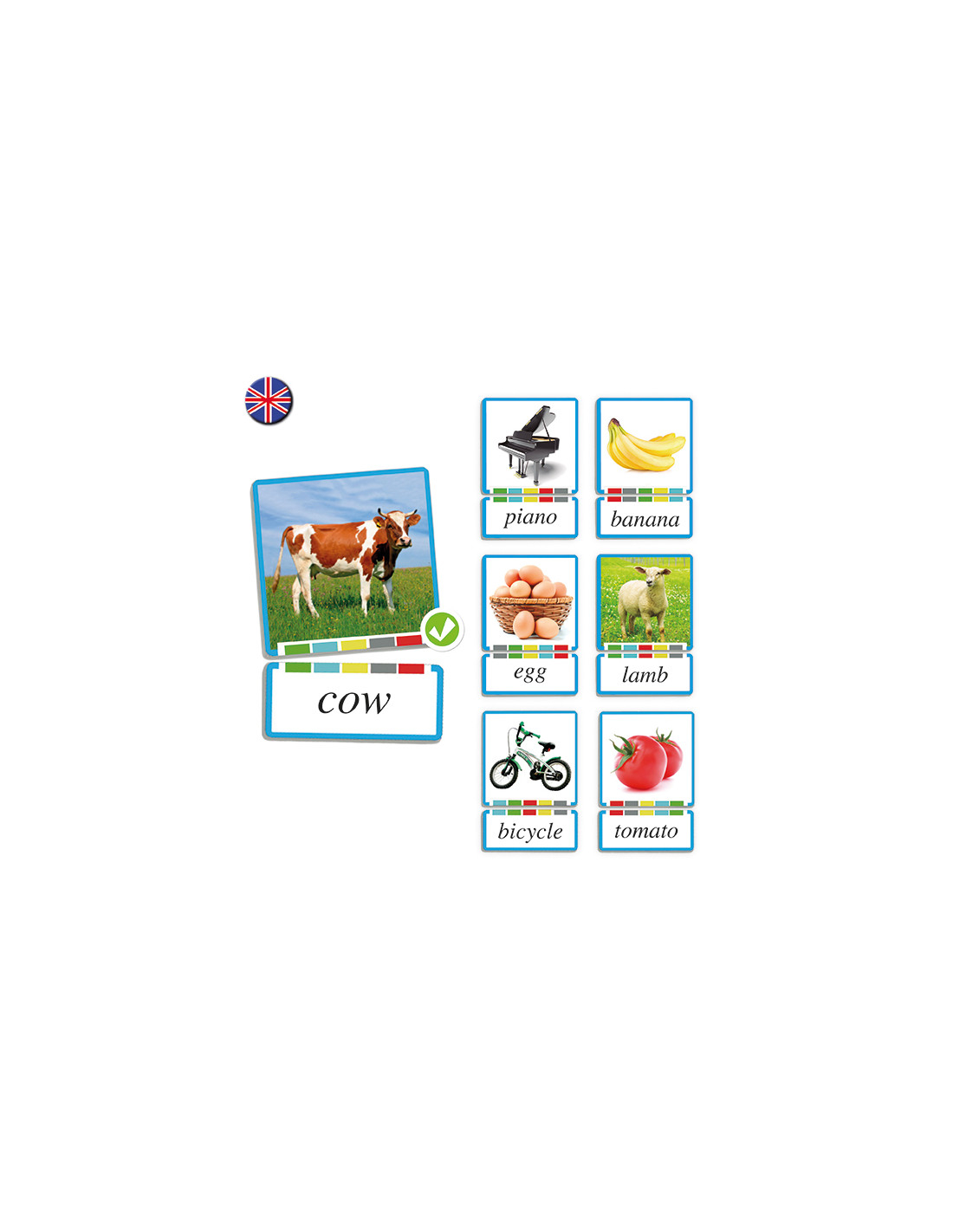 Un minunat joc de asociere a substantivelor din limba engleza cu imaginile lor corespunzatoare. Contine: 108 carduri cu imagini (7 x 7 cm) si 108 carduri cu substantive (7 x 3 cm). Cardurile sunt realizate din carton gros, compact, plastifiat si sunt foarte rezistente. Jocul are un „sistem de autoverificare” compus dintr-o banda cu 5 culori.