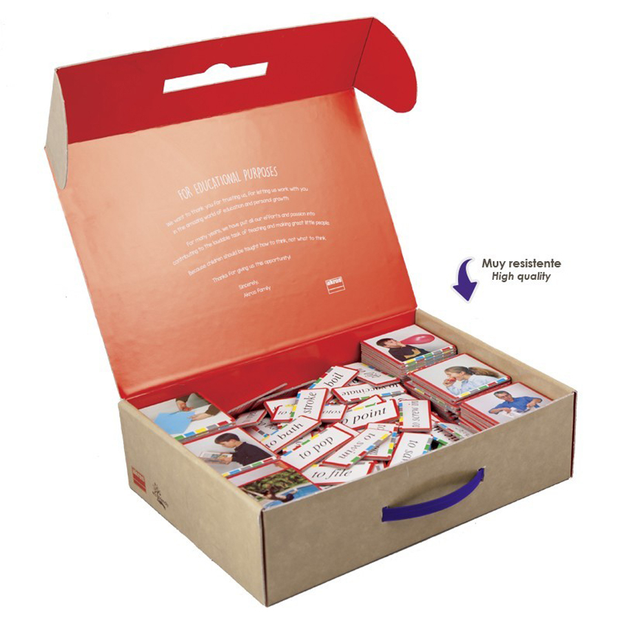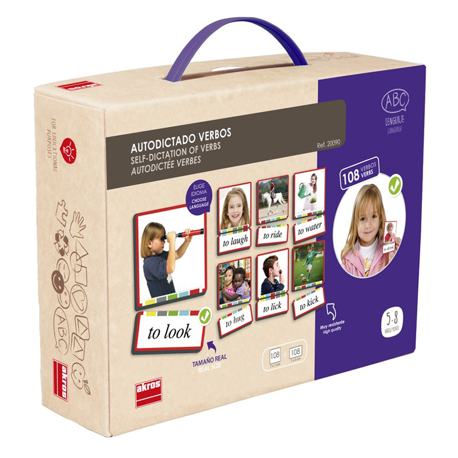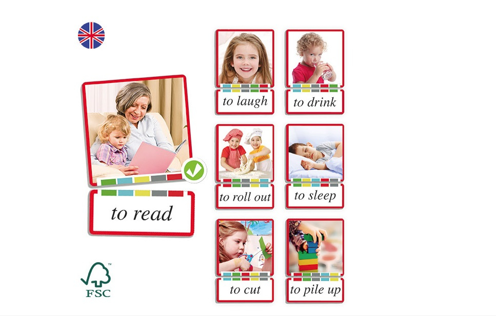 Un minunat joc de asociere a verbelor din limba engleza cu imaginile lor corespunzatoare. Contine: 108 carduri cu imagini (7 x 7 cm) si 108 carduri cu verbe (7 x 3 cm). Cardurile sunt realizate din carton gros, compact, plastifiat si sunt foarte rezistente.Jocul are un „sistem de autoverificare” compus dintr-o banda cu 5 culori.