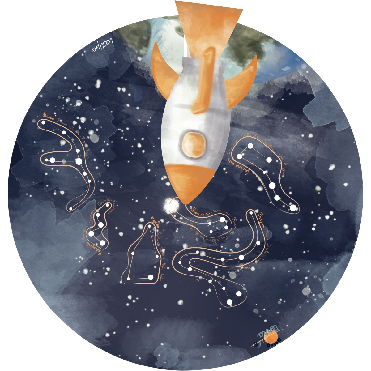 Explorează spațiul la bordul roții Astro Terra, pornind într-o călătorie prin limitele universului pentru a descoperi relațiile dintre Pământ, Lună și Soare. Prin rotirea fiecăreia dintre cele 4 rulete mici, micii astronauți vor putea să înțeleagă cum se manifestă anotimpurile, să descopere cele 8 faze ale lunii (1-lună nouă, 2-lună în creștere, 3-primul pătrar, 4-lună convexă în creștere, 5-lună plină, 6-lună convexă în descreștere, 7-ultimul pătrar, 8-lună în descreștere) și să afle mai multe informații despre principalele caracteristici ale Pământului și Soarelui. În plus, partea din spate a ruletei indică principalele constelații, pe care copiii le pot proiecta pe un perete, cu ajutorul unei lanterne. Diametrul ruletei este de 48 cm. Denumirile sunt în limbile franceză, engleză, germană, spaniolă și italiană.