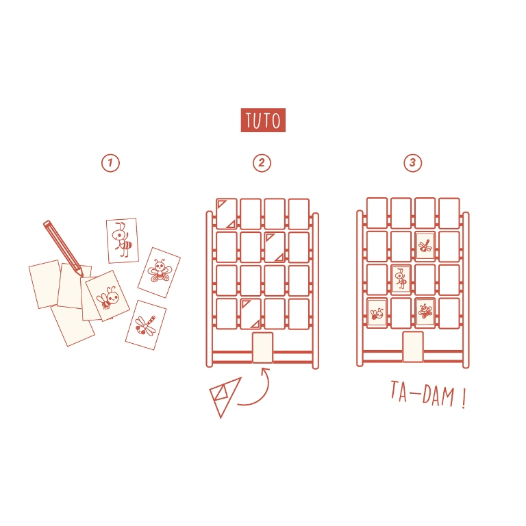 Copiii sunt invitați să-și creeze propriul joc desenând, lipind fotografii cu familia sau prietenii lor sau personalizând cartonașele de hârtie cu autocolante sau ștampile. Jocul începe prin a-și întreba adversarul despre caracteristicile fizice ale personajului găsit. Autocolantele nu sunt incluse. Copiii pot da frâu liber imaginației pentru a personaliza acest joc după cum doresc!
