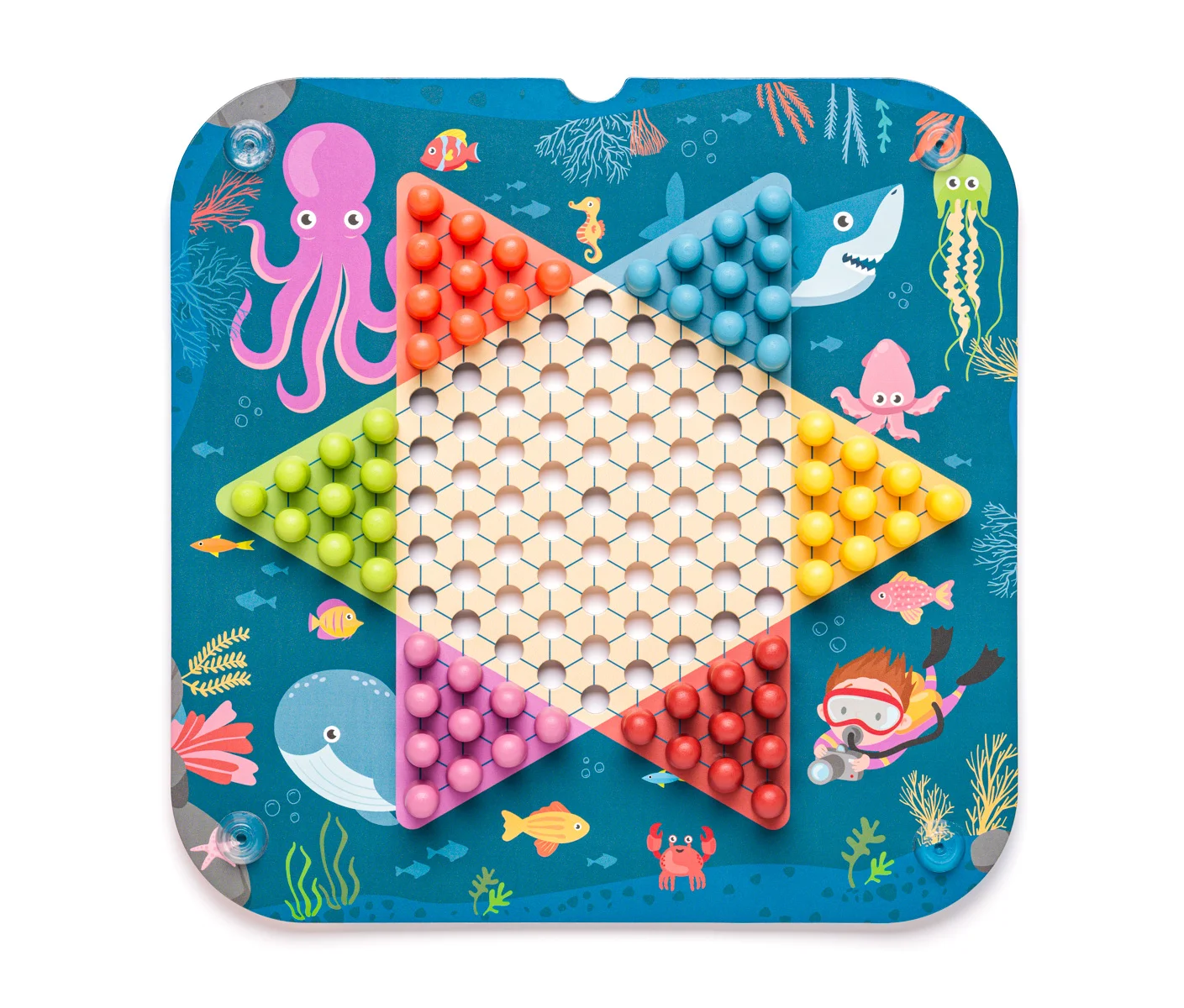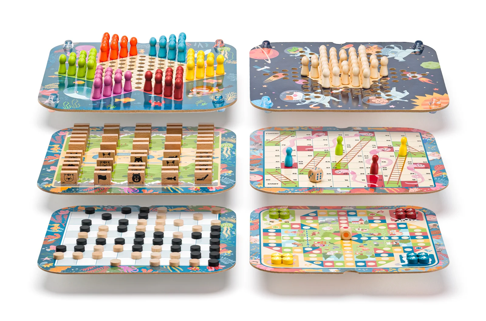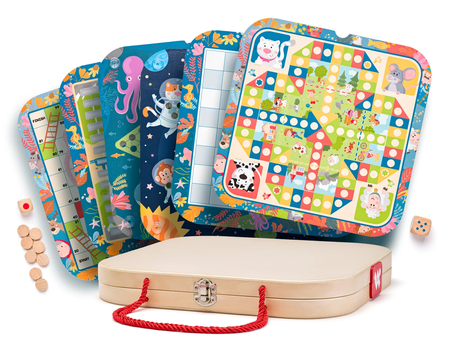 Toate jocurile preferate într-o singură cutie! Setul conține 3 table de joc cu 2 fețe și piese pentru jocuri de societate pline de amuzament: Nu te supara frate, Cel mai puternic câștigă, Șah chinezesc, Șah de memorie, Șerpi și scări, Dame și Go. Totul este bine depozitat într-o cutie solidă din lemn, ușor de transportat oriunde. Dezvoltați abilitățile de gândire și de calcul în timp ce jucați clasicele jocuri, concepute pentru a stimula logica, gândirea matematică, dar și spiritul competitiv, într-un mod distractiv. Dimensiuni table de joc: 27 x 27 cm.