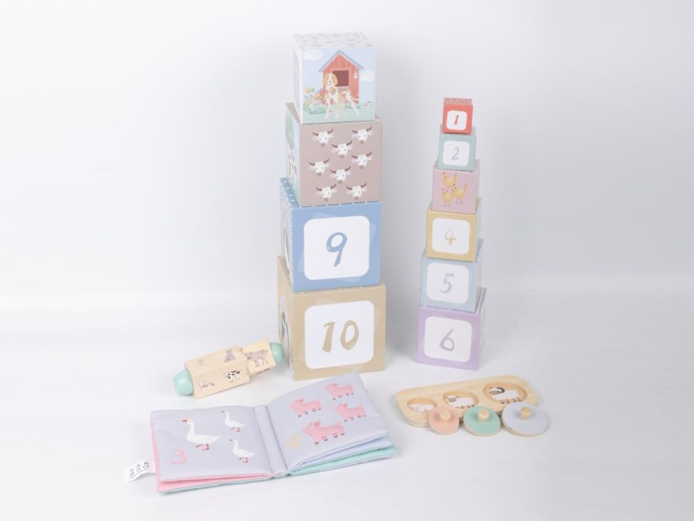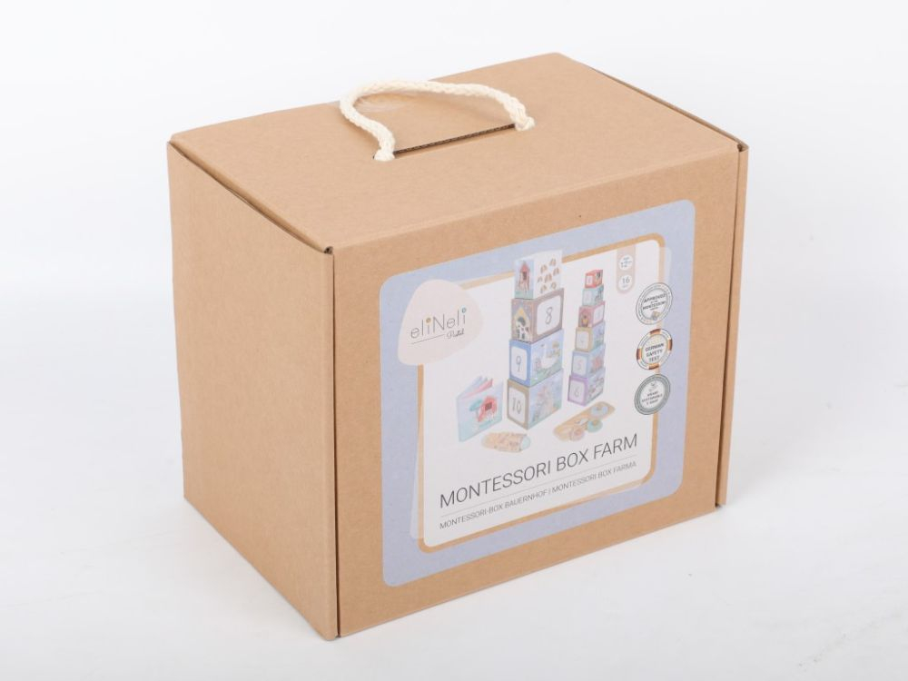 Cutia educațională cu jocuri și jucării tip Montessori este o combinație atent aleasă de jucării educative, concepută pentru copiii cu vârsta de peste 1 an. Cele 4 activități incluse stimulează dezvoltarea naturală a copilului prin joacă, respectând principiile pedagogiei Montessori. Prin explorare și joacă, cei mici descoperă animalele, mediul în care acestea trăiesc, culorile și numerele, dezvoltându-și în același timp imaginația și gândirea logică. Fiecare element este realizat din materiale naturale, sigure și durabile, oferind o experiență autentică și plăcută. Jucându-se cu acest set, copiii își dezvoltă motricitatea fină, coordonarea ochi-mână, percepția spațială și abilitățile cognitive. În același timp, sunt încurajați să învețe prin descoperire, într-un mod natural și captivant. Cutia conține 4 jocuri educative: 1.Set de 10 cuburi stivuibile. Include cuburi mari, ușor de manevrat, ilustrate cu numere, animale și mediul în care acestea trăiesc. Cu ele, cei mici pot construi, sorta și asocia elementele, descoperind relația dintre animale și habitatul lor și asocierea dintre numere și cantități. Dimensiunile celui mai mare cub: 13,6 x 13,6 x 13,6 cm. 2.Joc de memorie - Miel, oaie și berbec. Este format din 4 piese: baza pe care se introduc cele 3 piese rotunde cu buton, care, atunci când sunt ridicate, dezvăluie, pe rând, membrii familiei ovine: mama-oaie, tatăl-berbec și puiul-miel. Piesele sunt ușor de potrivit, fiind ideale pentru mânuțele mici ale copiilor. Ajută la dezvoltarea motricității fine, a răbdării și a înțelegerii relațiilor logice. Dimensiuni: 20 x 8 cm. 3.Puzzle rotativ cu animale. Un joc inedit din lemn, format din 3 cuburi care se rotesc pe un ax, formând familii de animale, iar cei mici învață să le recunoască și să le asocieze corect (adult - pui). Prin rotire, ei descoperă combinații noi și își dezvoltă vocabularul. Jocul stimulează gândirea cognitivă, memoria și dezvoltarea limbajului. Dimensiuni: 16 x 4 x 4 cm. 4.Carte textilă cu animale și numere. Îi introduce pe cei mici în lumea numerelor, culorilor și animalelor, într-un mod prietenos și sigur. Poate fi folosită pentru primele exerciții de numărare până la 8 și pentru recunoașterea vizuală a elementelor. Susține dezvoltarea percepției vizuale, tactile și a limbajului. Dimensiuni: 28 x 14 cm. Dimensiuni cutie: 62 x 48 x 17 cm.