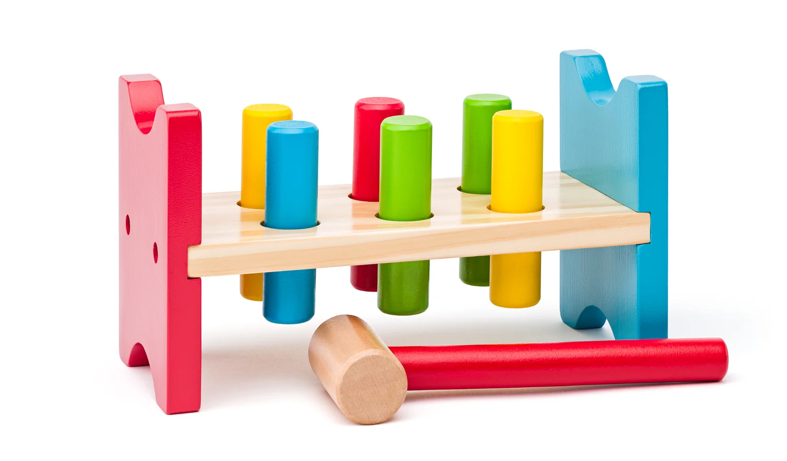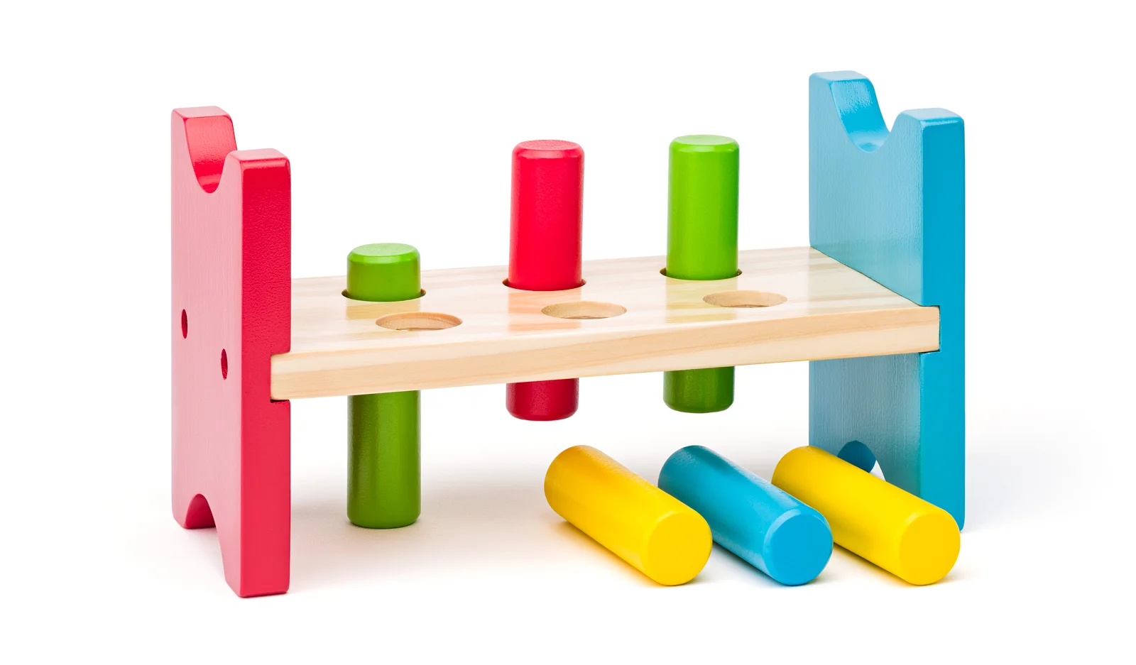 Un banc de lucru portabil, care antrenează capacitatea de înțelegere a relației cauză-efect și abilitatea de a recunoaște culorile, prin lovirea formelor colorate cu ciocanul. O jucărie potrivită atât pentru fete, cât și pentru băieți. Conține 8 accesorii colorate din lemn și este ideal pentru dezvoltarea abilităților motorii fine și a creativității copiilor. Dimensiuni: 25 x 18 x 11 cm.