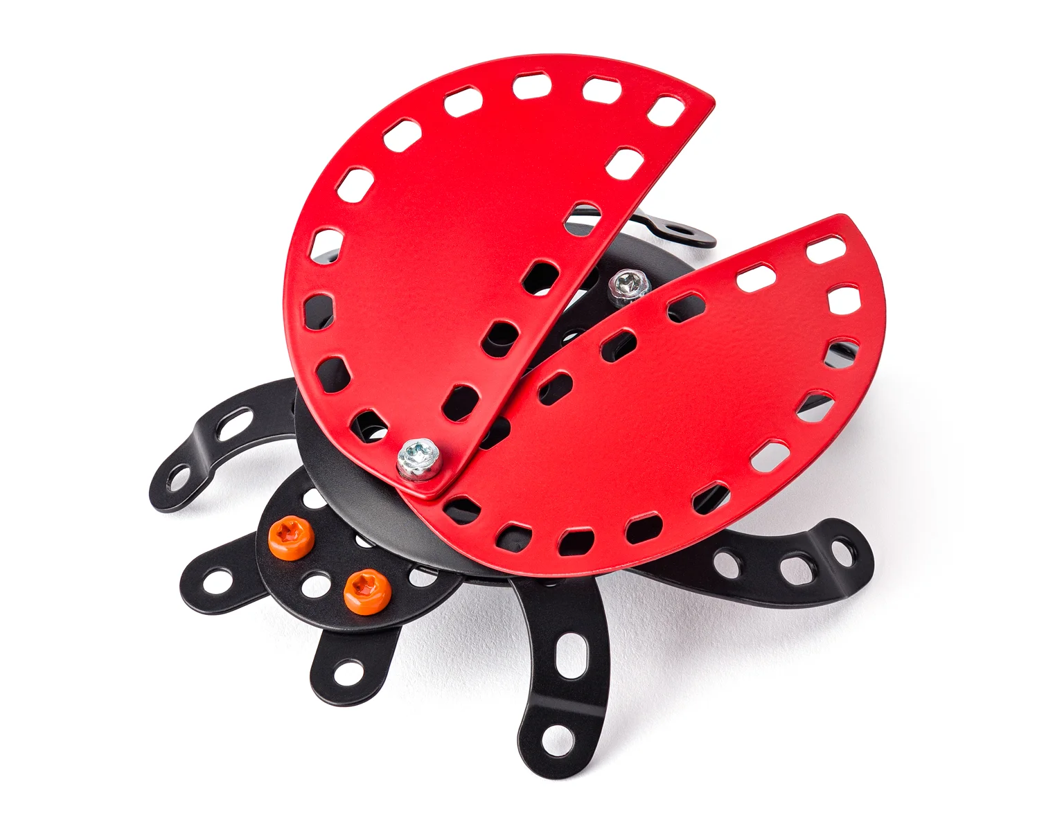 Explorează lumea construcțiilor reale cu setul clasic de construcție, ideal pentru dezvoltarea abilităților tehnice și a imaginației. Fii inspirat, provocat și lasă-te uimit în timp ce îți explorezi creativitatea și imaginația. Cele 37 de piese metalice din set se îmbină ușor cu șuruburi și permit construirea unei buburuze de 10,5 x 9 x 4 cm. Dimensiuni ambalaj: 18 x 13 x 5 cm.