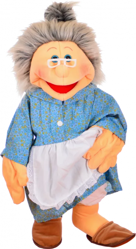 Ea are păr argintiu, ochelari, rochie cochetă după moda veche și un șort drăguț de bucătărie. O păpușă de mână ușor de manevrat atât de copii, cât și de adulți, fiind special creată pentru a fi animată. Nu conține elemente ascuțite sau dure pentru a împiedica accidentarea și a permite smotoceala în voie! Materialele folosite sunt de foarte bună calitate, cusute pentru a fi folosite mult timp, iar micile detalii adăugate vor surprinde în mod plăcut orice amator de distracție. Are rol educativ: cu ajutorul acestei jucării, copiii își dezvoltă mai bine vocabularul și imaginația. Datorită materialului are o atingere foarte fină, ceea ce aduce un plus de plăcere copiilor. Această jucărie a fost concepută atât pentru joaca individuală sau în grup, cât și pentru terapeuți – fiind folosită cu mare succes în gestionarea comportamentelor agresive la copii. Terapeutul sau educatorul va folosi marioneta pentru a crea un partener de dialog, iar copilul îi va asocia personajului o personalitate reală, transformându-l într-un prieten cu care este mai ușor să comunici (decât cu adultul care se află în spatele jucăriei). Jucăria poate fi spălată manual sau la 30℃ în mașina de spălat și uscată la aer. Nu se recomandă curățarea chimică sau călcarea cu fierul. Haine complet detașabile. Dimensiune 65 cm.