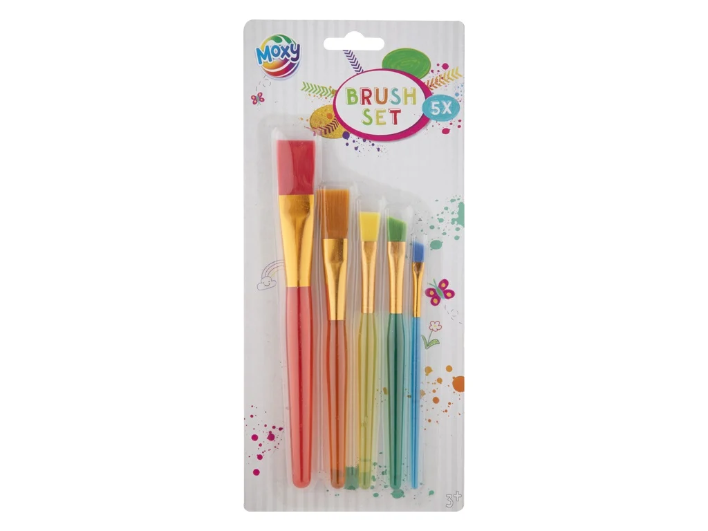 Set de 5 pensule colorate, de dimensiuni diferite, ideale pentru diferite tehnici de pictură: 2 pensule groase, 2 pensule subțiri și o pensulă subțire.