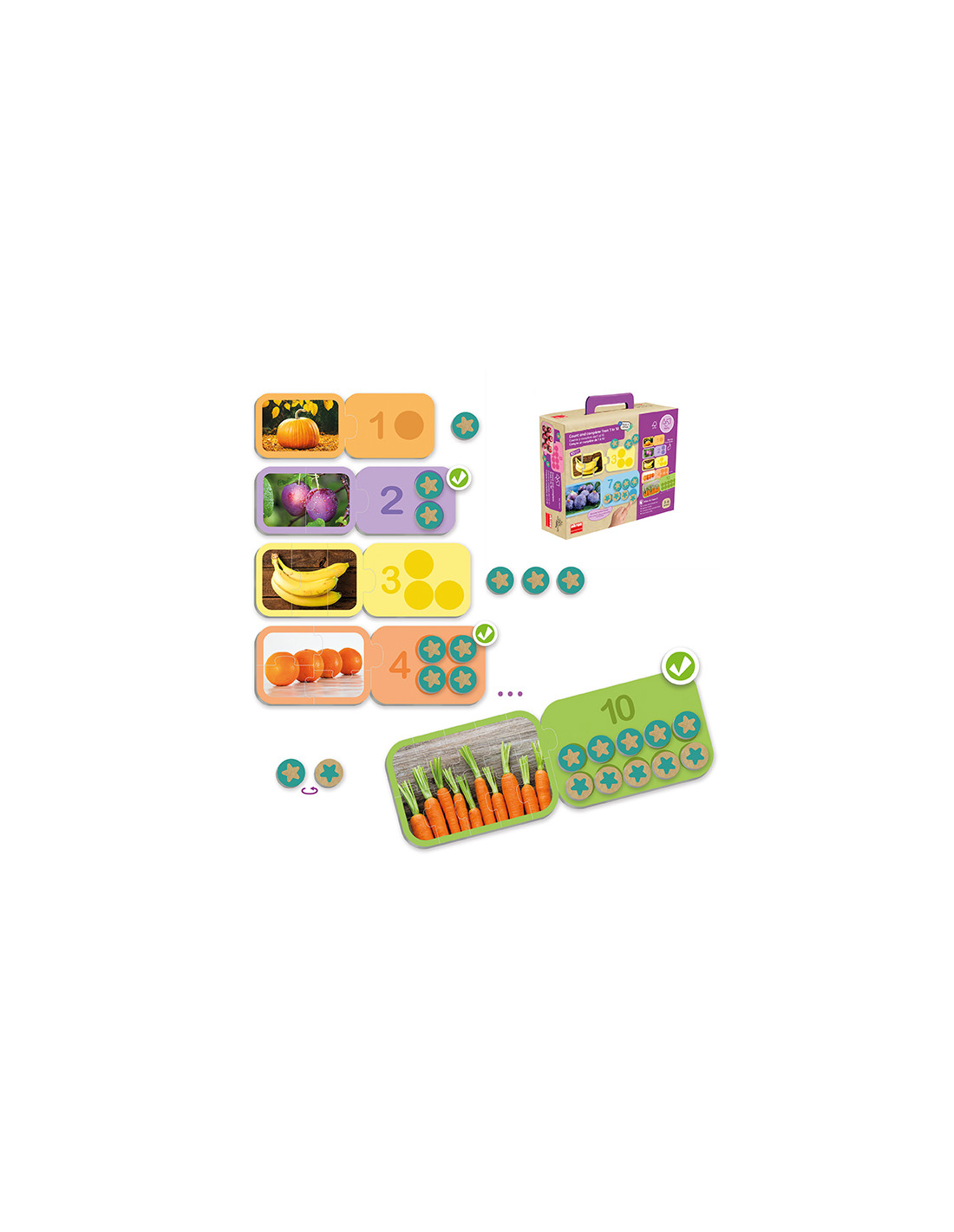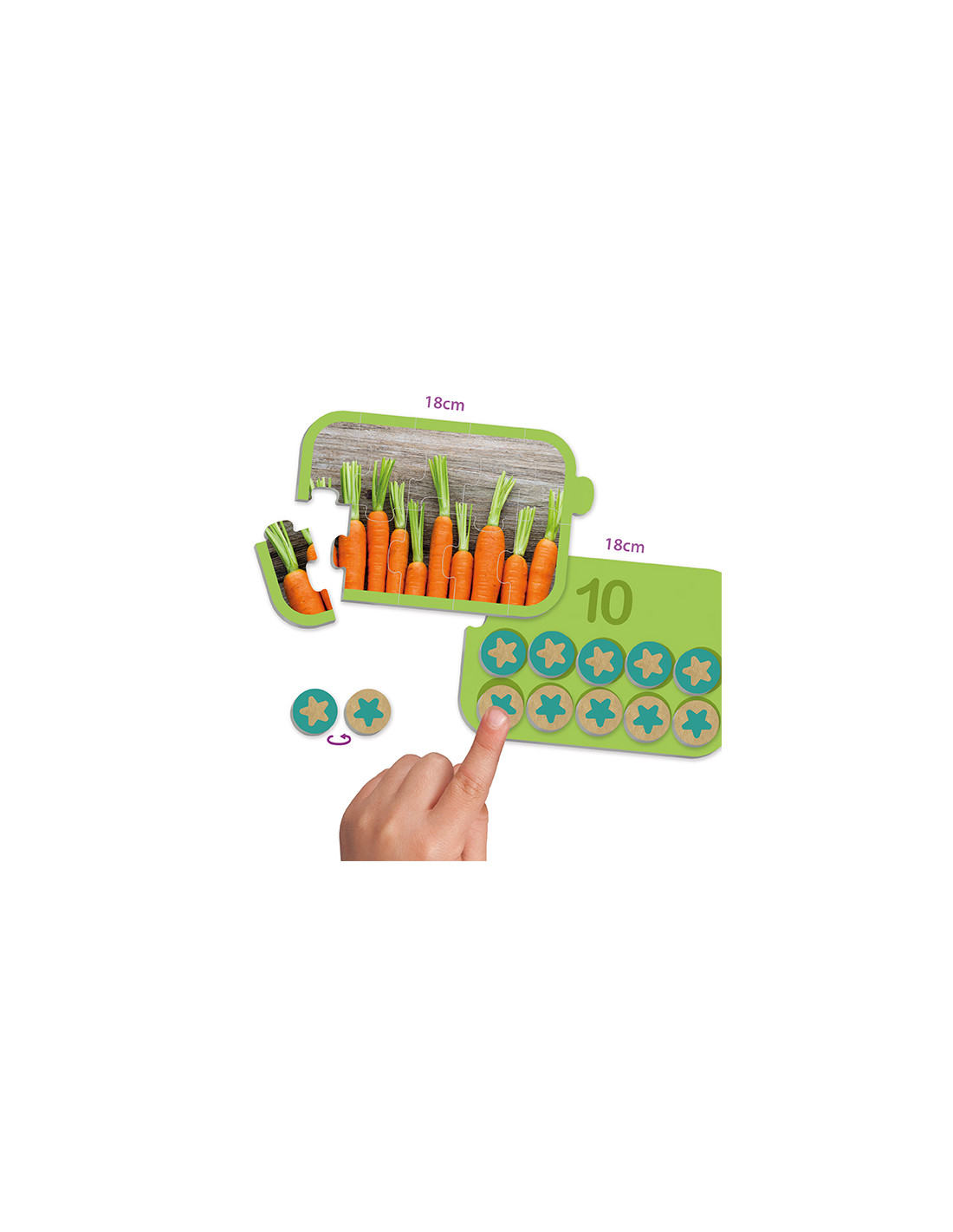 Acum este foarte ușor să numeri până la 10 și să pătrunzi în tainele aritmeticii, folosind cele 20 de piese de puzzle mari, din carton solid. Jocul ajută în special la întelegerea raportului număr-cantitate. Completează cele 10 puzzle-uri, numără elementele din imagini și acoperă bulinele cu numărul de jetoane rotunde corespunzătoare cifrei indicate. Jocul este potrivit, de asemenea, pentru înțelegerea descompunerii numerelorîntr-un mod vizual, intuitiv.
