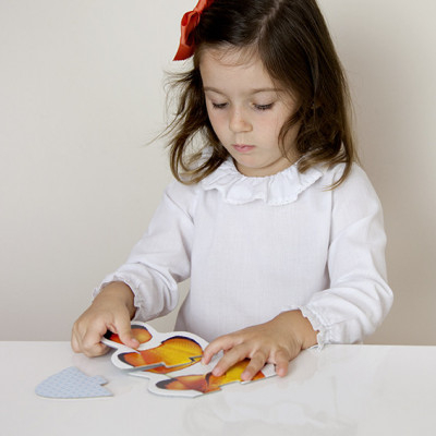 9 puzzle-uri de dimensiuni mari, cu 3 si 4 piese care ilustreaza imagini cu diferite animale. Piesele sunt realizate din carton gros, rezistent, durabil si de foarte buna calitate. Puzzle-uri cu 3 piese: broasca testoasa, elefant, peste clovn, papagal si pisica. Puzzle-uri cu 4 piese: fluture, câine, urs panda si buburuza. Fiecare puzzle are pe verso o culoare distinctiva pentru a facilita gruparea pieselor aceluiasi puzzle. Dezvolta spiritul de observatie; îmbunatateste coordonarea psihomotorie si dexteritatea manuala prin manevrarea pieselor si îmbinarea lor în mod corect; îmbogateste vocabularul de baza.