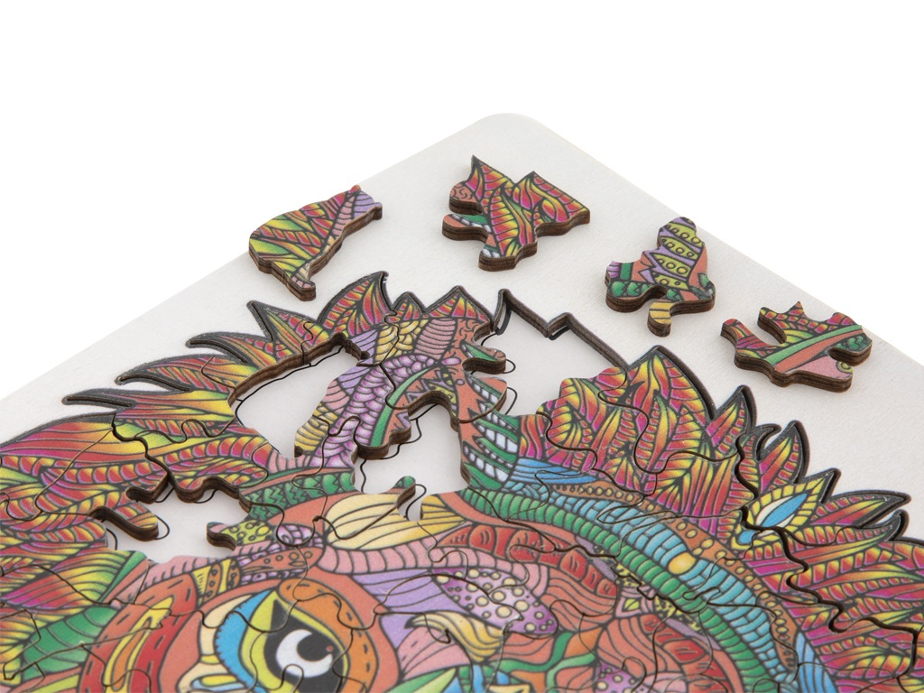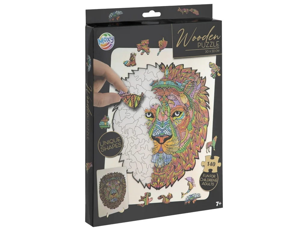 Cele 140 de piese din lemn au forme cu totul deosebite, ceea ce îi va atrage atât pe cei mici, cât și pe adulți. După finalizarea asocierii pieselor, va rezulta o adevarată operă de artă, plină de viață și culoare! Fiecare piesă este unică și se îmbină perfect cu celelalte, deoarece toate piesele au fost tăiate folosind lasere precise pentru a asigura marginile netede care se potrivesc perfect. Jocul de puzzle ajută la dezvoltarea multor abilități: îmbunătățește concentrarea, spiritul de observație, memoria și rezolvarea de probleme, dezvoltă percepția spațială, motricitatea fină, recunoașterea formelor, coordonarea ochi-mână și abilități matematice. Dimensiuni:32,5 x 22,5 x2,5 cm.