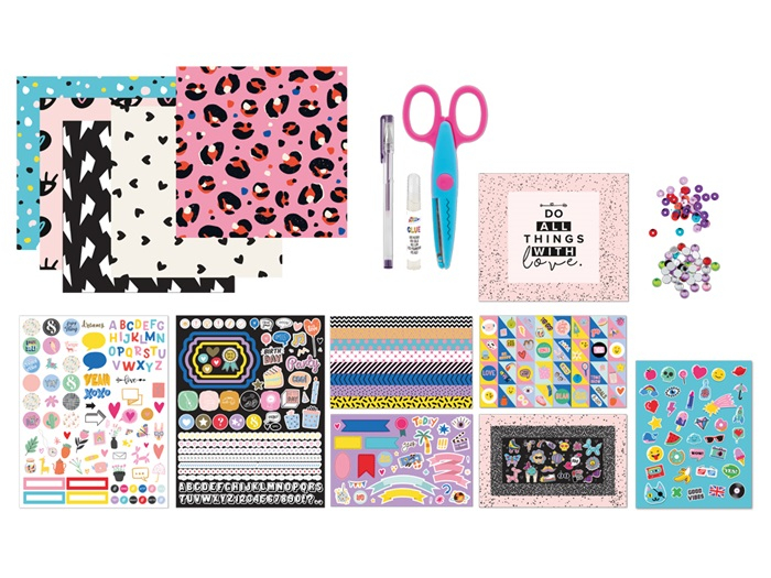 Creeaza-ti si personalizeaza-ti propriul jurnal folosind toate accesoriile din acest set. Datorita numeroaselor accesorii incluse pix, lipici, foarfeca, paiete, stickere etc.), fiecare copil isi va putea exprima creativitatea si isi va poate organiza activitatile zilnice intr-o maniera estetica. Dimensiuni: 30 x 30 x 4 cm