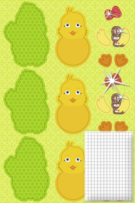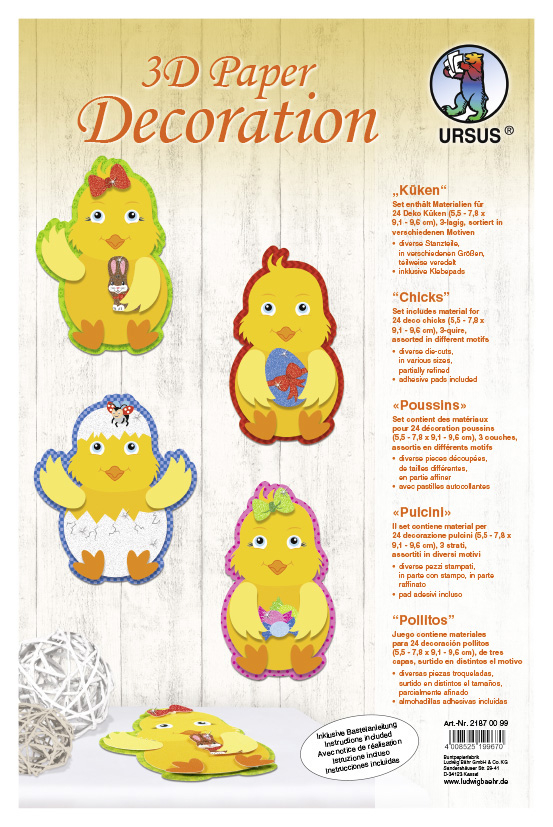 Cu ajutorul acestui set creativ puteti realiza 24 de puisori de gaina decorativi 3D in diferite culori, pe care apoi ii poti folosi pentru a decora diferite obiecte personale sau pentru a adauga un plus de culoare camerei tale. Setul contine: 4 coli din carton cu aproximativ 60 de cartonase pretaiate, patratele adezive si instructiuni de lucru. Dimensiunile unui pusor finalizat: 6,5 x 9,5 cm.